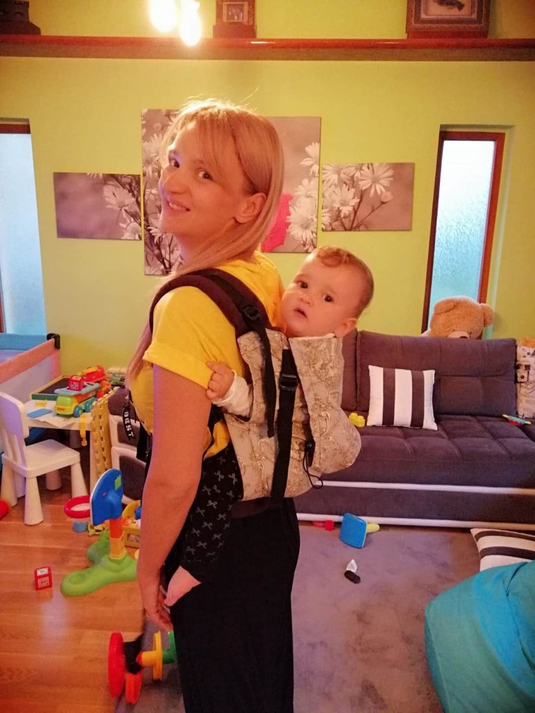 Today we have been relieved of wonderful Bazzinga carrier! The first impression was that the live was much more beautiful than in the pictures. I do not know why I had such an impression, because the colors and the pattern are just like in pictures, but it is somehow more beautiful to me live. As far as wearing and comfort, it was perfect for me! Nowhere did not bother me, we were easy to fit and the baby was really enjoying wearing. He sang a little, and was a little sleepy. Otherwise, the baby had 10.5 months and about 12 kg. The great baby that this carrier has endured without any problems. Big thanks for everyone in the group Lenine putujuce nosiljke i marame (Lena’s travelling carriers and wraps) and Nosiljke za bebe Bazzinga for this opportunity to enjoy wearing baby and me.