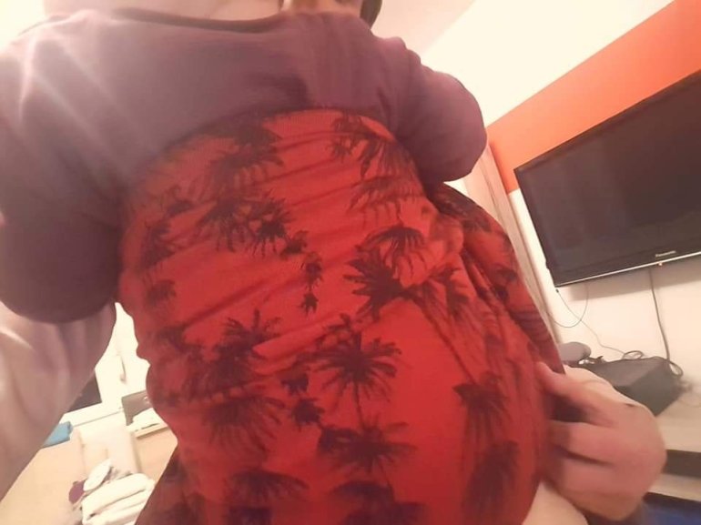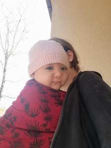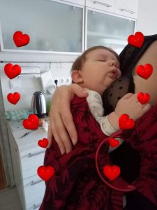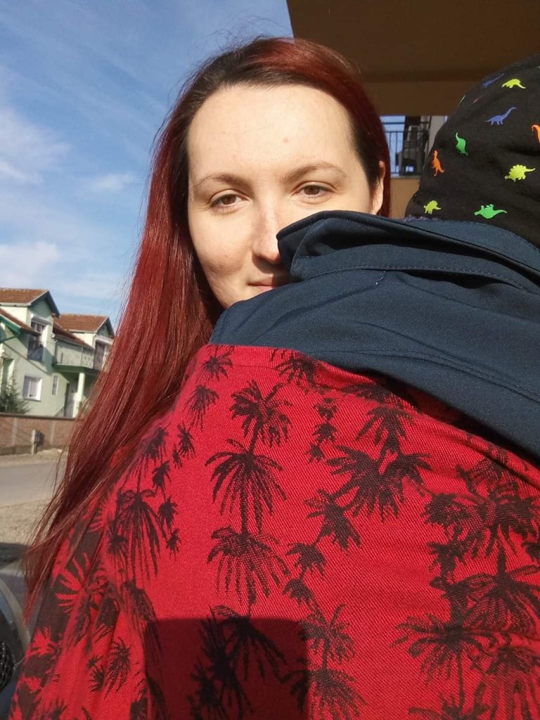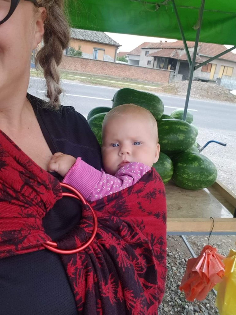 Thanks to Lenine putujuce nosiljke i marame (Lena’s traveling carriers and wraps) we tested this lovely sling last week. It’s Luluna Slings Algae Roja, 260 gsm, 100% combed cotton. This sling is soft, comfy, has nice grip and glide. Given that sling and I are generally on a war foot, with this one I managed to find a common language and I wrapped it in that way my shoulder or back doesn’t hurt. It holds tight my baby that is 6 months old and has 7300g.