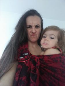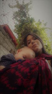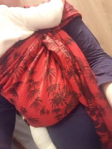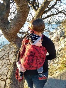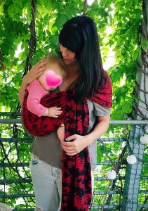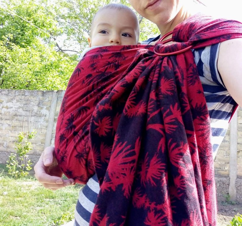 I had a chance to test Luluna Slings Algae Roja. This was the first sling that I tried. My wrappe is 3 months old and has 6 killos. Although I had no experience at all with ring slings, it was no challenge to wrap it for the first time, so I think it’s great for beginners like me. The colors are beautiful, I like black and red, it was easy to fit it with my outfit, it’s very soft, comfortable and I didn’t feel his weight at all. Only it seems to me, for these summer days that’s lie ahead, it is a slightly thicker fabric.