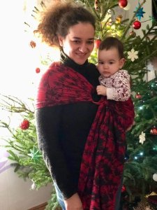 I must say that when I first saw the photo of the sling, I fell in love with the color and the pattern so I did everything in my power to get it. When it arrived, the initial feel did not fail me- the wrap is as soft as kitten’s fur 😂 and the colours are even more intense irl! Fortunately, it arrived around the holidays so we had the perfect color wrap for Christmas 🎄 thanks again admins of #lenastravelingcarriers for the extended stay 😉 The wrap was comfortable to wear, considering. Why this “considering”? Don’t get me wrong, I really enjoyed it, the texture, the softness, the colors, the pattern – however, due to its 260gsm, I am confident that this particular wrap is better suited for smaller babies 👶🏻 (in comparison even to some other Lulunas you can see in the pictures) as I felt a bit of strain in my back and shoulders when wearing it for longer stretches of time. The grip-glide ratio is great- the wrap glides though the rings very smoothly yet stays in place once it is set.