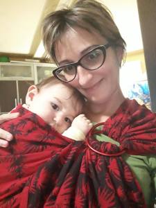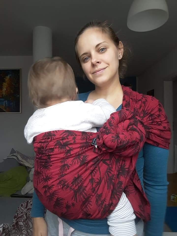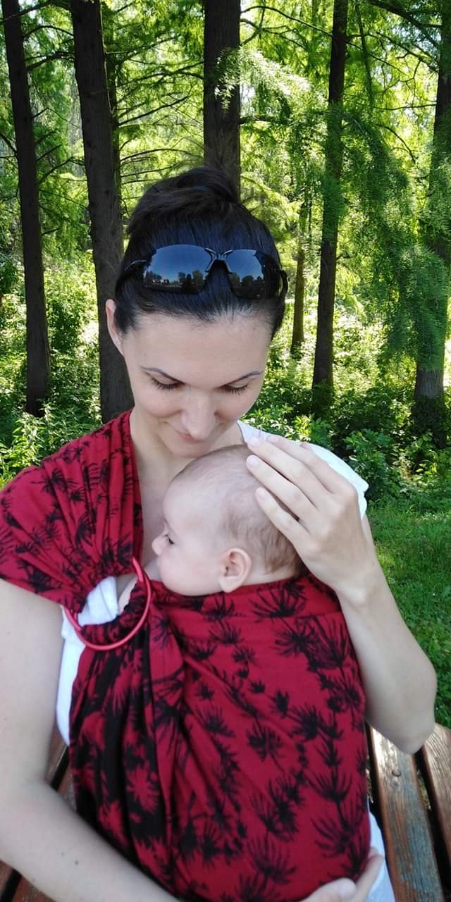 Thanks to Lena’s traveling carriers and wraps, we had an opportunity to test Luluna Slings Algae Roja, 260 gsm, 100% combed cotton. As I expected- it is soft, comfortable and lovely. Wrapee is 4 – month-old baby and has about 6 and half kg. As I was putting ring sling on me, she was very interested in colors and pattern so I can say she liked it. It is very easy to use and everything stays on its place even after few hours. I think this ring sling is easy to be liked and loved by not only experienced users but also by those who are starters.