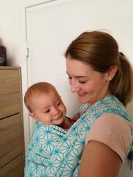 I was the second tester of this soft cloud. The baby has almost 10 months and about 9.5 kg. Wrap is easy to handle, not slip and firmly held. It tolerates even a bit clumsy tying and fast wrapping because the baby is very lively and impatient. I did not feel the baby’s weight, and we worn into a piece about 2 hours and over 2 km walk. The colors are beautiful and live and in pictures, beautiful contrast for bindings with flip. Wrap is ideal for beginners, older and harder children. At the first impression wrap acts like a blanket, but I did not feel that I was overly hot when we were worn.