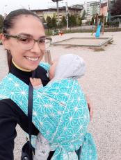 Thanks to the Lenine putujuce nosiljke i marame (Lena’s traveling carriers and wraps) I had the opportunity to try Chardan Celestial Sky, size 6. This is my base + 1, so I played a bit with some fancy finishes. My son was 8 months old, and he had 9+ kg during the testing period. Colors of the wrap are more vivid than in photos, I preferred turquoise side. The weave is very interesting and design as well, due to which this wrap has a fine amount of grip. However this wrap is not too grippy, it is easy to tighten in multi layer carries and interesting fact is that it doesn’t slip even when you tye a half knot. It came washed and ironed from previous tester so it felt heavier in hands than declared gsm. I love the wrap geekery, so I’ve measured it and I had a good feeling. The wrap was around 320 gsm postwash. Even though it was washed it didn’t need any additional breaking in. It has higher amount of diagonal elasticity, but it doesn’t sag. The thing that I loved the most about this wrap was how mouldable is it. Chest pass in DH looked amazing. I prefer a little bit narrower wraps, so I had a feeling sometimes that I have too much wrap on my shoulders. I tried it in a lot of carries but I really loved it in ruck carry.