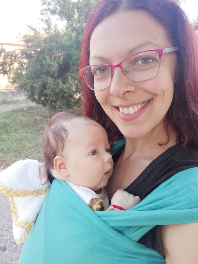 With my second child I used a ring sling but I couldn’t always find the best position, and since that was 10 years ago there wasn’t enough information about proper positioning and adjusting. I wanted to try out something now with my third child and the choice that seemed the easiest was the Hug bug elastic wrap. When I rented it I was still pregnant but I planned to use it wherever we went if I learned how to adjust it and the baby liked it. My girl is now 11 weeks old, she weighs 4900 and is only breastfed. She is much lighter than my older children and started gaining weight in the second month, the first she gained only 500g but is doing much better now. Not a pre term baby, the pregnancy was ok, but a bit sleepy the first month because of jaundice.