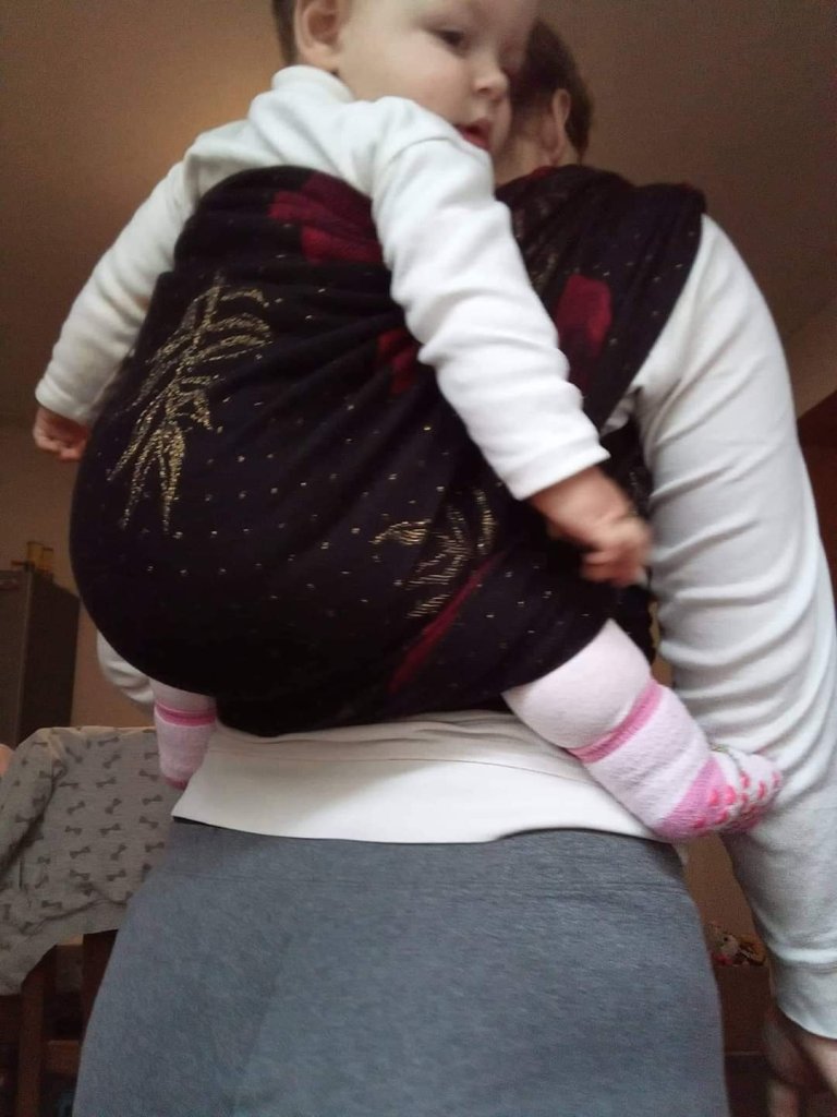 I’ve found my soulmate wrap. The dark side of it is even more prettier than in pictures, shiny side is not so overstated as I thought it would be. The knot is easy to tide, it’s not slippery and it feels as a clould on your shoulders not a baby of 11kg. We made a hour long walk in robin’s hip carry and I didn’t feel her weight. As I said, this is my soulmate wrap and I know what I’m buying myself for next wedding anniversary.