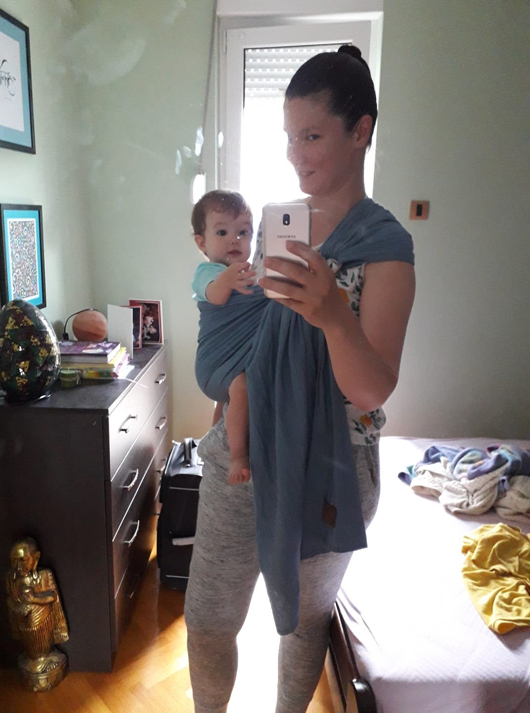 Thanks to Lenine putujuce nosiljke i marame (Lena’s traveling carriers and wraps) and STORK Ring Sling we had a chance to test this RS. It was my first time to use the RS. Since I have no experience I was surprised that I managed to put it on immediately. I was so happy and my baby was too. It seemed so easy, the material was light. But I gues it was only a beginners luck because every other day we didn’t manage to use it. I had a problem to adjust the RS and baby became nervous very quickly. It means that I have to practice more with RS. Baby is 11months old and around 8kg.
