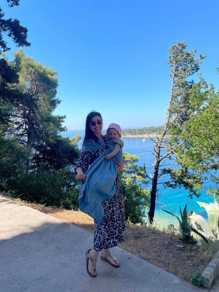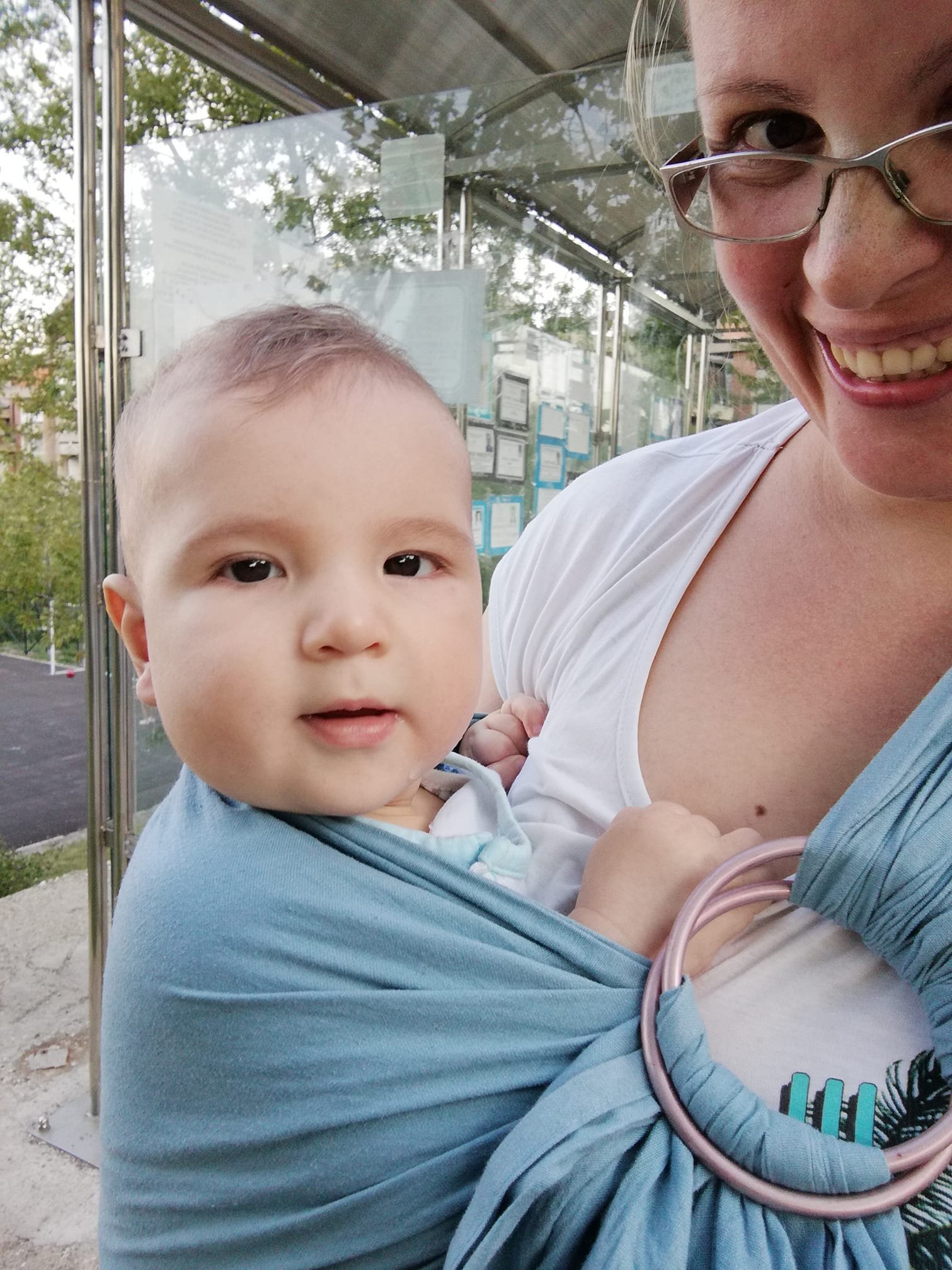Thanks to Lenine putujuce nosiljke i marame (Lena’s traveling carriers and wraps) we had the opportunity to test STORK ring sling. This was my first experience with ring slings, and to be honest, I loved it. The baby is 7 months old and has around 8kg. As a first timer I had some difficulties with adjusting the rings to the correct place and putting the baby in, as somehow the rings ‘moved’, however once I got the hang of it, it was great. I tried the front carrying and hip carrying, and I liked both, however I would prefer hip carrying, as that way the weight of the baby is evenly arranged. The material is nice, comfortable, and I believe it would be suitable for warmer days as it appears thin and airy. The color of it is not bad. All in all, this particular sling made me fall in love in rings slings, so I would definitely recommend it to everyone.