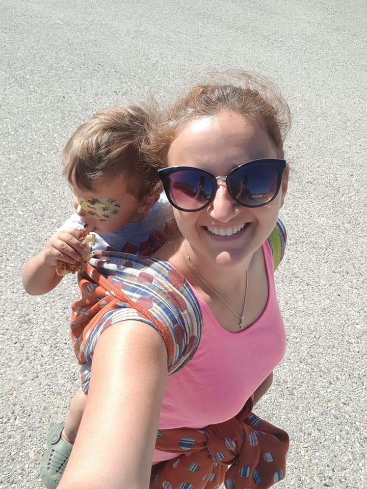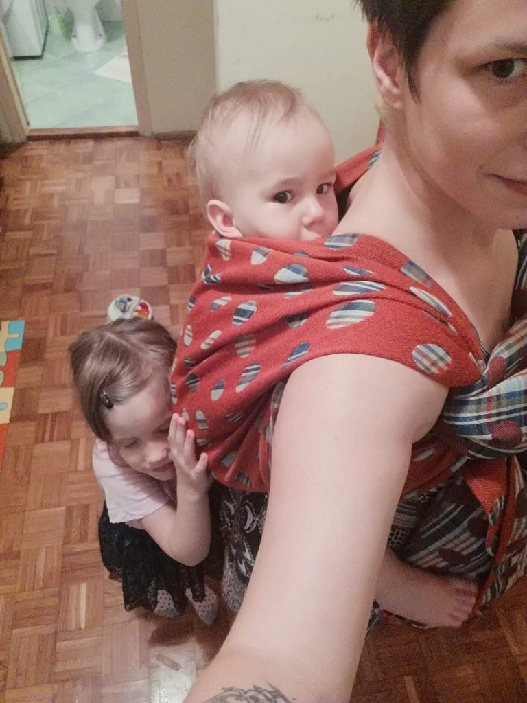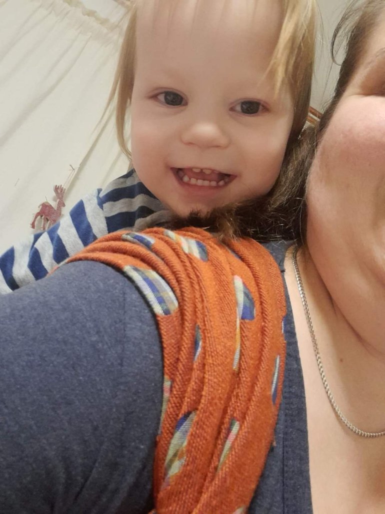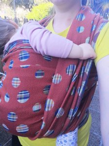 Thanks to Lenine putujuce nosiljke (Lena’s traveling carriers) I tested Avolve Crazy Dot Cobalt Pumpkin wrap. This wrap has an interesting and beautiful design. It is a bit thicker, so I would say it is more a toddler wrap than for smaller children. I did not quite like the wool as I have sensitive skin and it was a bit itchy for me, but all in all, this is a great wrap. I tested it with a 2 year old and one-month-old baby. Thanks again #lenastravelingcarriers