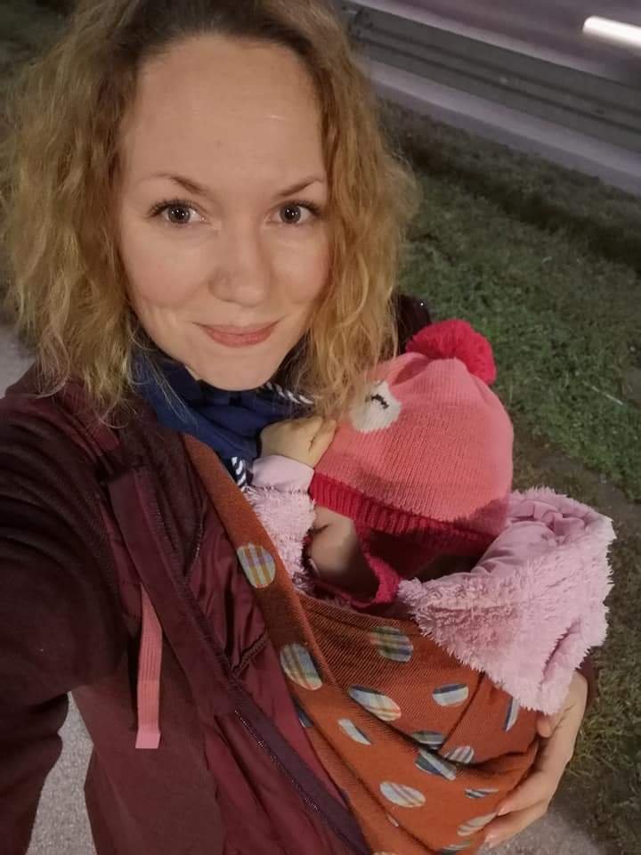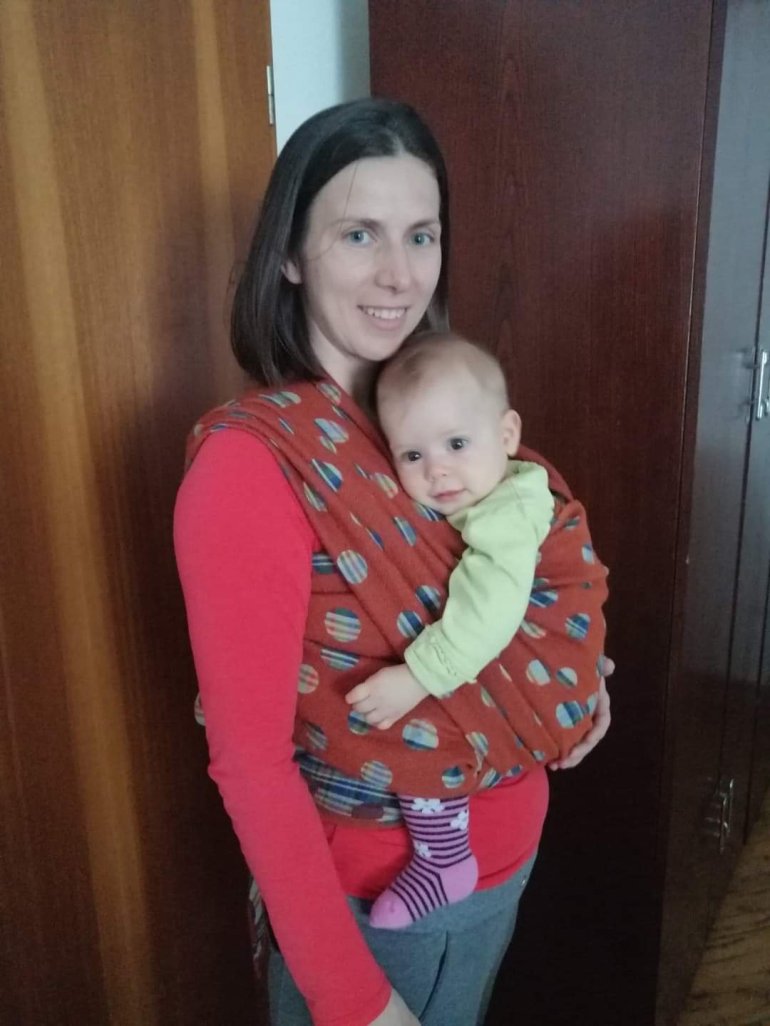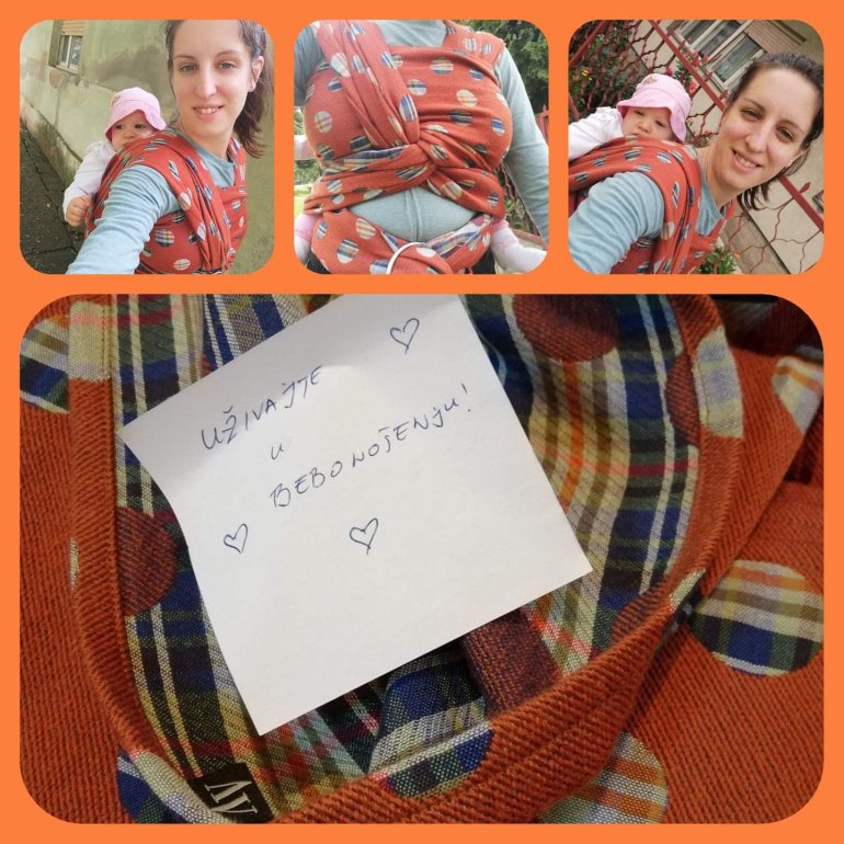 Thanks to Lenine putujuce nosiljke (Lena’s traveling carriers), I had the opportunity to try this beautiful wrapper. My baby is 6 months old and weighs 7.5 kg. I’m a beginner wrapper user. The headscarf is thick and heavy, so, at first, I was scared if I could tie it, but tying and fitting was ok. I easily tightened it exactly where it should be, I had a feeling that it had a little elasticity to it, in every case it is suitable for binding and handling. The colors were a beautiful autumn motif so we blended perfectly with the falling leaves outside. I didn’t feel the baby’s weight, my wrapper remained positioned on my shoulders, it didn’t chafe me or anything. I can fully recommend this wrapper.