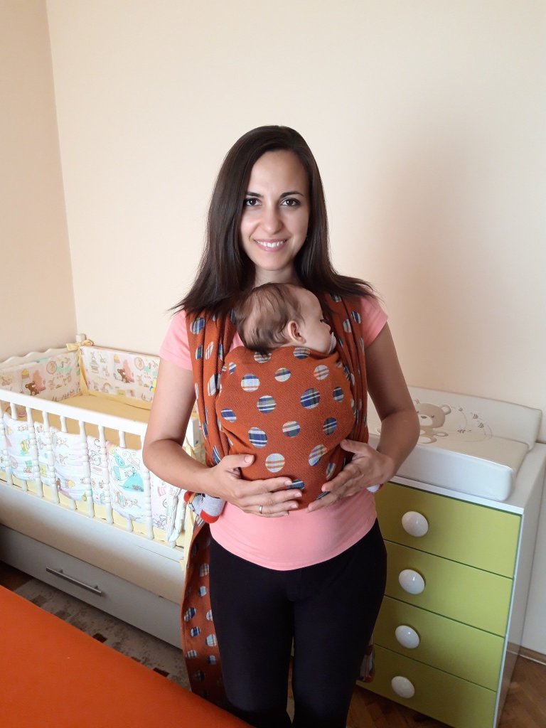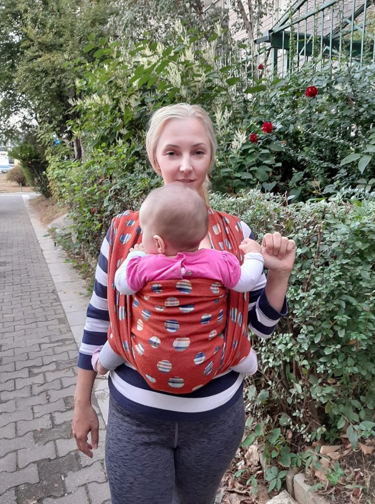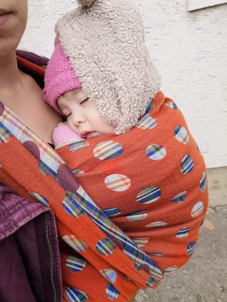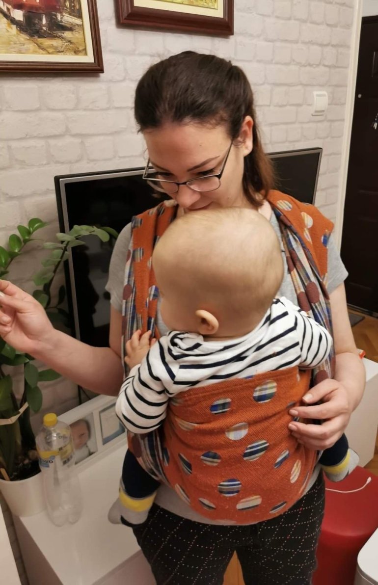 Thanks to Lenine putujuce nosiljke (Lena’s traveling carriers) we tried Avolve Crazy Dot Cobalt – Pumpkin. This is ticker wrap, suitable for bigger children and colder weather. The fabric is a little bit itchy because of the wool, but the pattern is very cheerful and beautiful. My baby is 4 months old and around 6 kg weight #lenastravelingcarriers