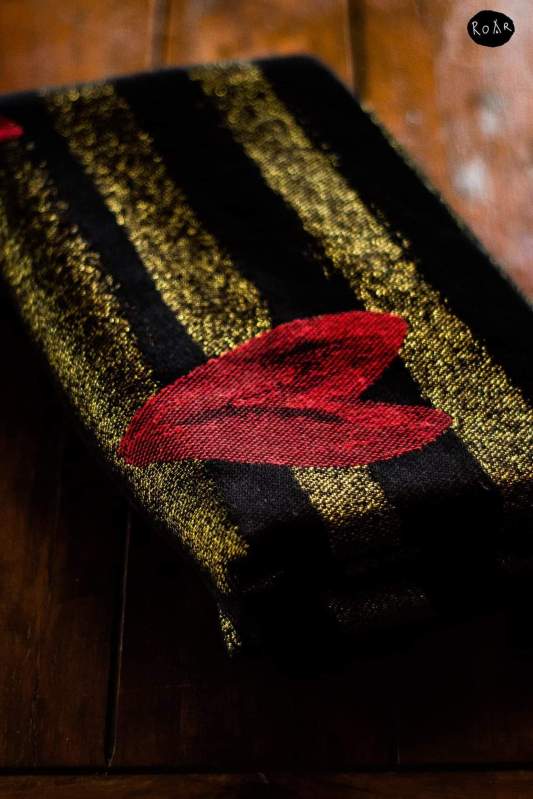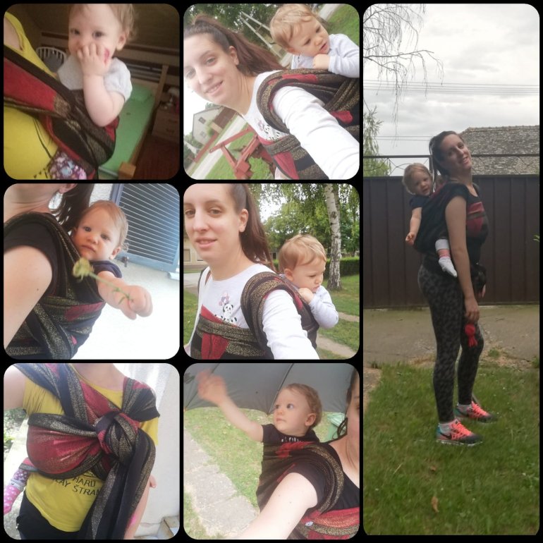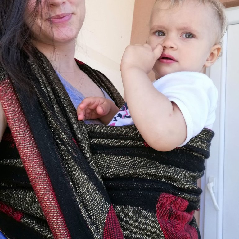 We are enjoing in this beautiful wrap about month. It can be used for special occasions as it has metalized glossy fibers and elegant colours, but also for everyday walking as well. Red hearts are really pretty. It’s thick, perfect for cold days. During warm days, the metalized parts can damage bare skin, especially during setting-up. My baby is 5 months old, and about 6kg. I want to thanks Lenine putujuce nosiljke (Lena’s traveling carriers) and ROAR for the oportunity to rent this beauty.