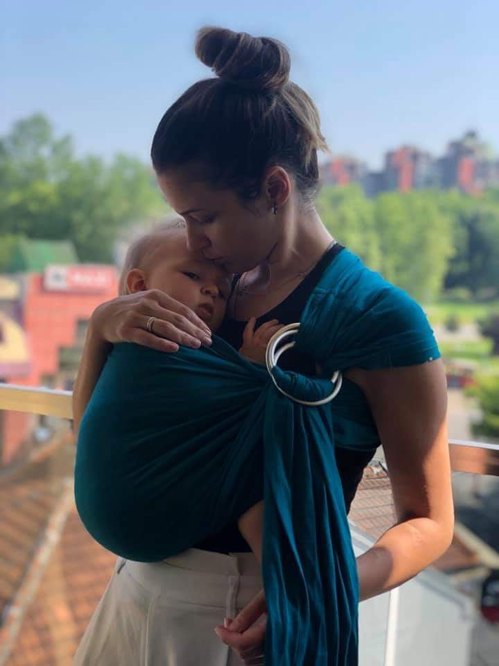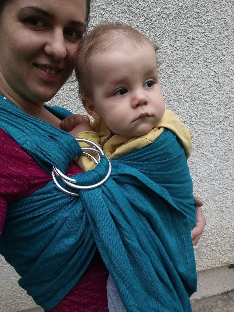 Thanks to Lenine putujuce nosiljke (Lena’s traveling carriers) we have chance to rent and use this sling every single day. The color and material are perfect. This hibrid ring sling have two pairs of rings, so i have double support for my big baby. I like this ring sling very much. It’s longer than others ring slings but it’s fine with me.