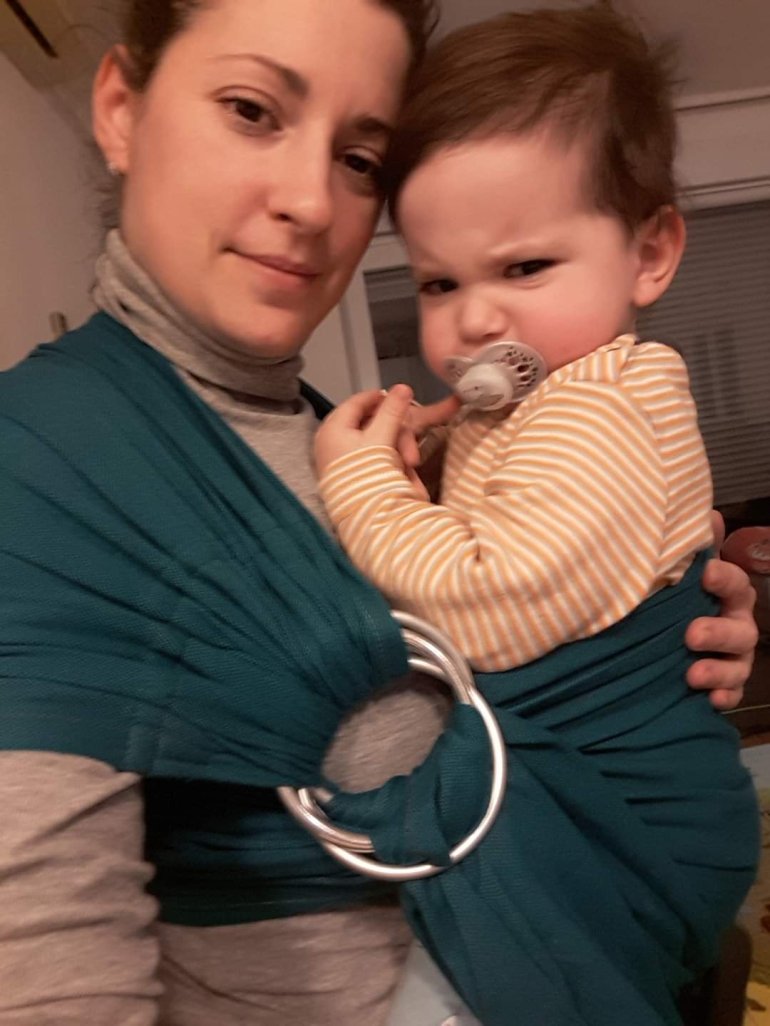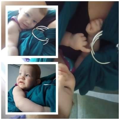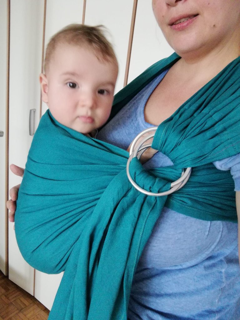 Thanks to #lenastravelingcarriers we tried this ring sling. First my impression is color, it so beautiful. Material is soft and glides nicely trough the rings, and provides comfort just like wowen wrap. Interesting is these two pair of rings. I must say that l didnt know how to put it since I watch the you tube tutorial. After that it was easy. We use it for classic front carry, baby tester is 6 months and 7,5 kilos.