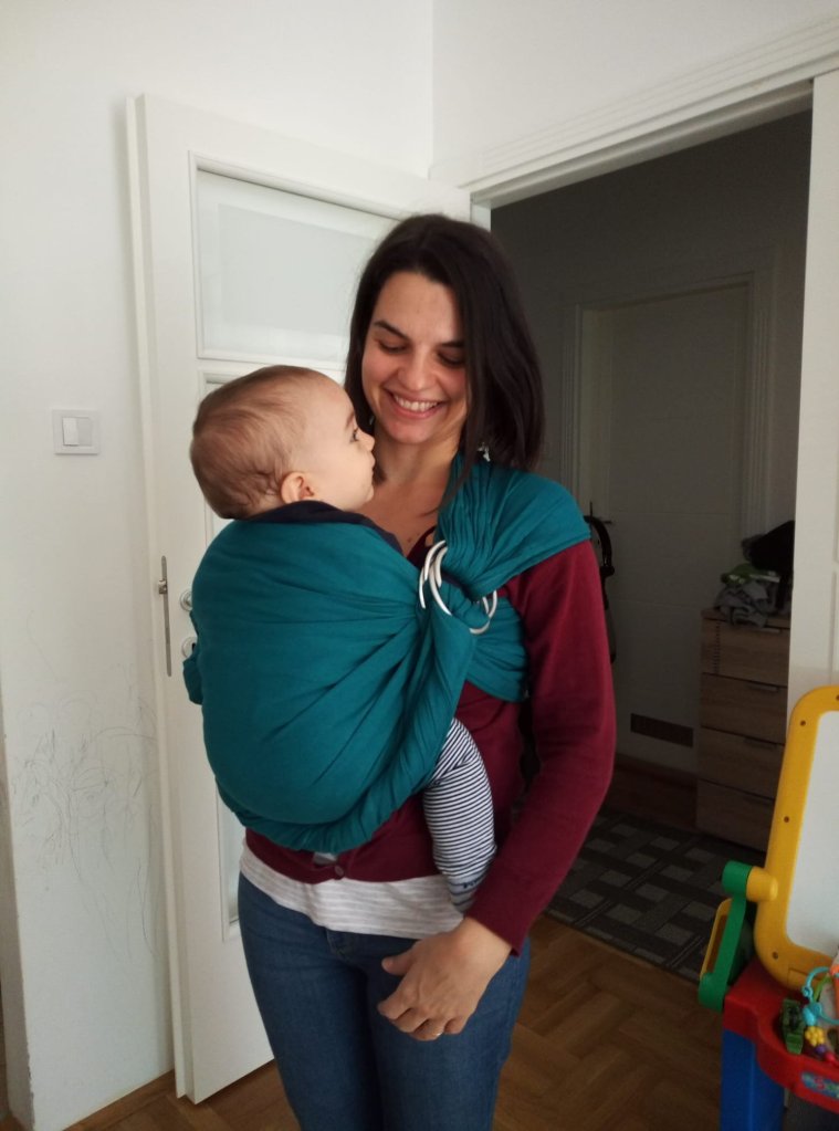 Thanks to Lenine putujuce nosiljke (Lena’s traveling carriers) we had opportunity to test this ring sling/wrap. I can say that this was interesting experience, I liked the fabric, colour and fact that I didn’t feel my son’s weight at all, but I didn’t like it’s length. I could wrap my baby only at home, before we leave the house. All in all, it was interesting. Thank you for chance to try something like this.