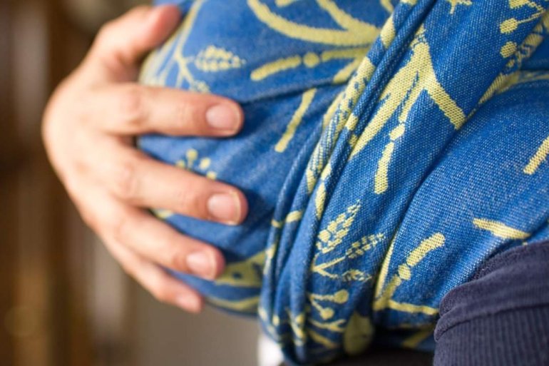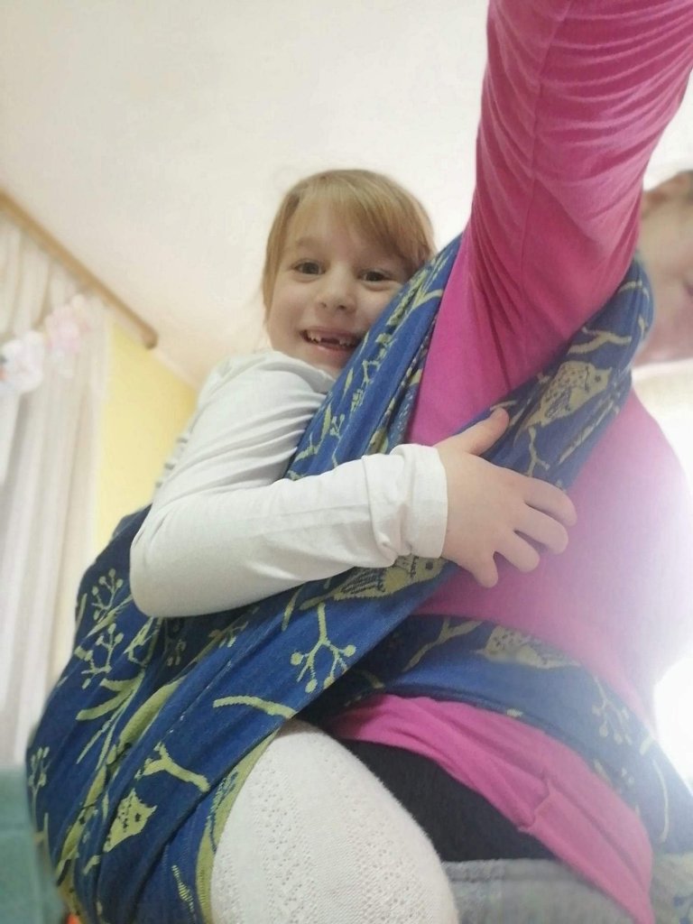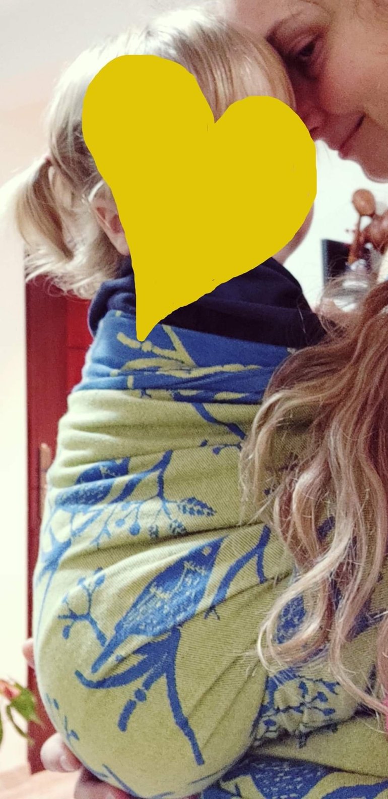 I immediately fall in love with this design, blue color with amazing yellow birds, wonderful! I really enjoy in softness of this woven wrap, unfortunately I couldn’t enjoy as much as I wanted because I am beginner in carrying and this woven is too long for me, but big recommendation to everyone with experience.