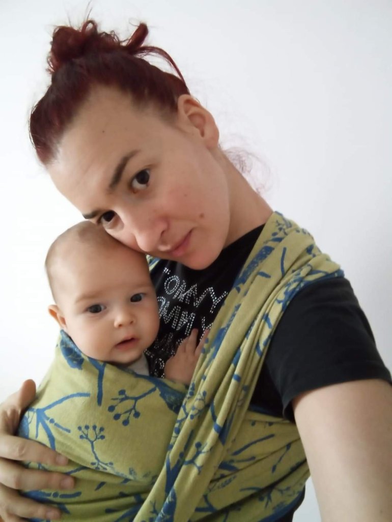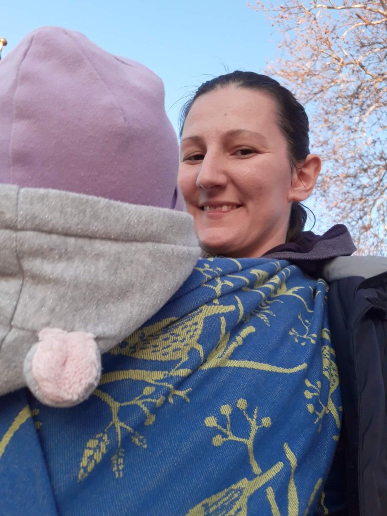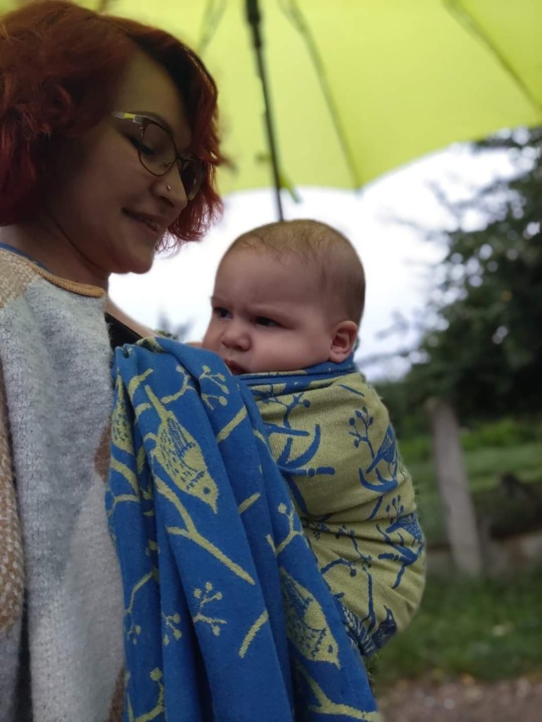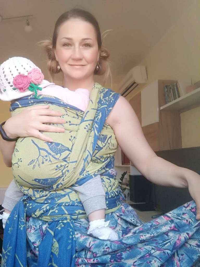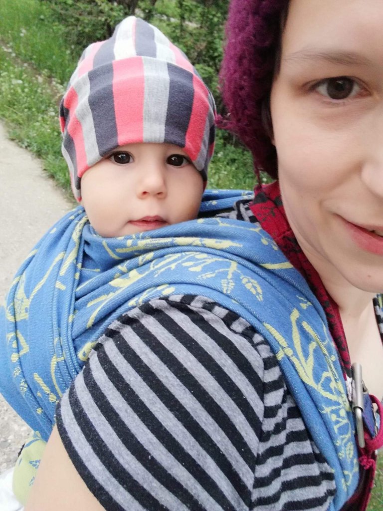 There is some secret link between the real wrap and carrier: that’s what everyone who wears their babies knows and they have the opportunity to try different wraps. I have this opportunity thanks to this dear group of Lenine putujuce nosiljke i marame (Lena’s traveling carriers and wraps). Birds are one of those who immediately lay down, firm, and thin wrap that are easy to mout. I have the impression that it’s a little longer than 6. The colors are great and they are easy to combine, for the walks in the nature, it just calls you to take it there.