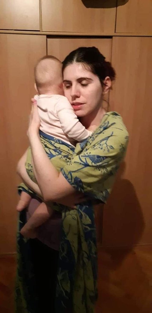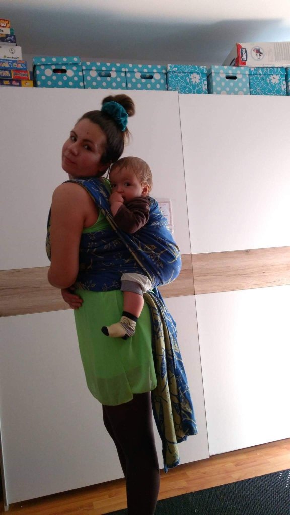 My little girl and I had a chance to test this wrap and enjoy it. The wrap is beautiful, soft, wonderful color combinations and looks beautiful on both the green and blue sides. It is easy to tighten and in terms of weaving and material composition it is very good for beginners like the two of us. What didn’t suit us was the size of the wrap, it’s longer than the standard six, so the rest is too long, it falls to the ground in a fwcc, and it’s a little complicated for me to learn to put the baby on my back. We somehow compensated for that length with different finishes, so this length is ideal for those who like to play with finishes. At the time of carrying the baby was 5 months old and weighed about 7kg. I would definitely like to have this scarf, but in size 4 or 5.