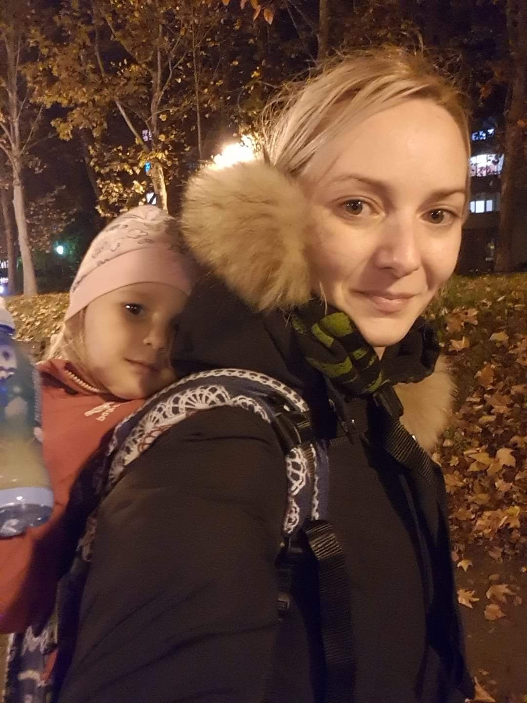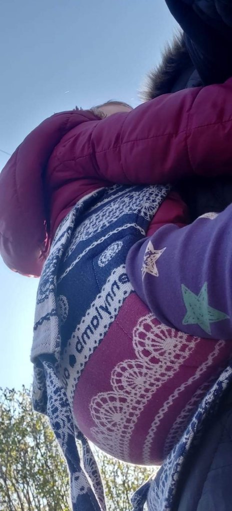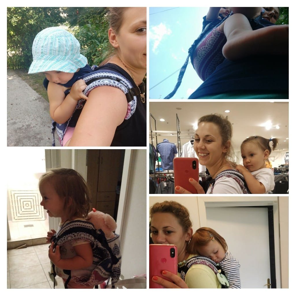 Thanks to Leninim putujucim nosiljkama (Lena’s travelling carriers), we have the opportunity to enjoy Lanna Lamb Todler Onbuhimo. The colors are pretty and Dad especially liked them. Also an adjustable panel is a good solution as the baby is a toddler at 15 months of age. The straps are soft but would be more comfortable if they were more loaded. I am 8 months pregnant, so a half hour walk is comfortable for me and my baby girl. Dad uses it more often. Hitting the long walk the baby lowers slightly, perhaps because she is still small and suits her when the panel is narrowed.