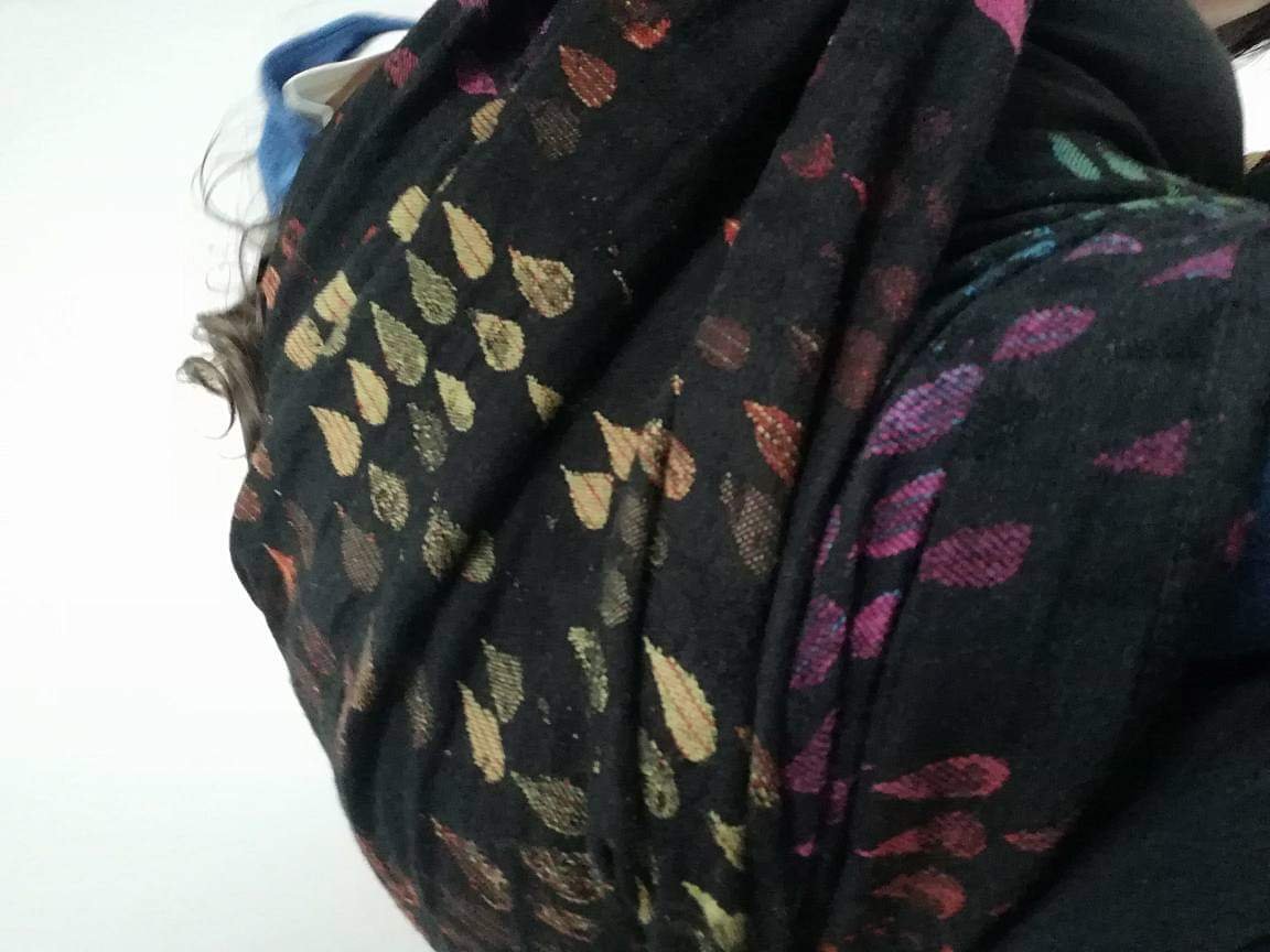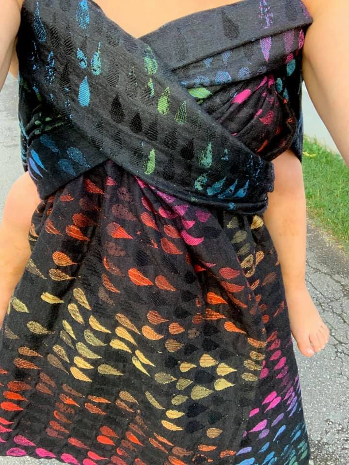 In my mind forever the Dark Queen of Droplets, from today on known as the Drops of Jupiter, 100% merino prototype skyrocketed to the top of my list. It was love at first glance, continued to love at first wear. Even though I normally prefer high silk content blends with a low amount of bounce, this one surprised me with versatile characteristics I didn’t expect from a 100% merino wrap. When you say 100% merino, first that comes to my mind is saggy feeling. Like when you tie a carry and your baby starts at the one position and over time they end up much much lower. Well, my girl is now almost 3 years old, around one meter in height and weighing 15kg. Ultimate sag test. This wrap, no matter its merino content, stayed in place. WOW. I tried it with my new-born nephew too, at the time 2,5 weeks old, and though it provided nice and snuggly soft support, still I wouldn’t choose it as a newborn wrap, versatile as it is. It definitely can do, but regular quads perform much better with tiny squishes due to their ‘thinness’.