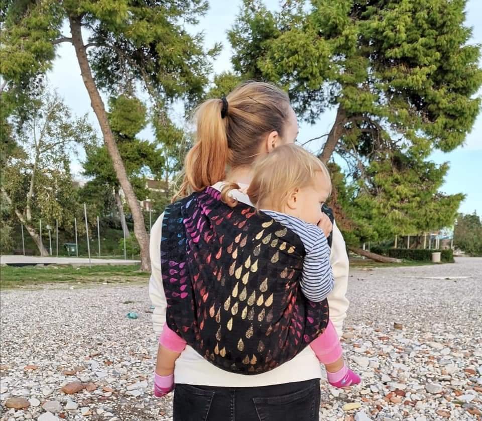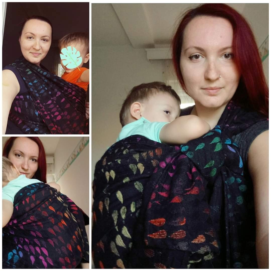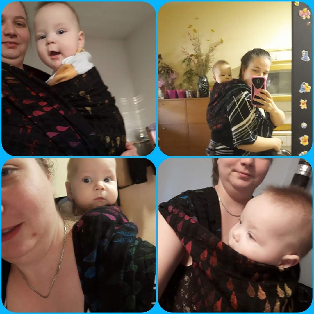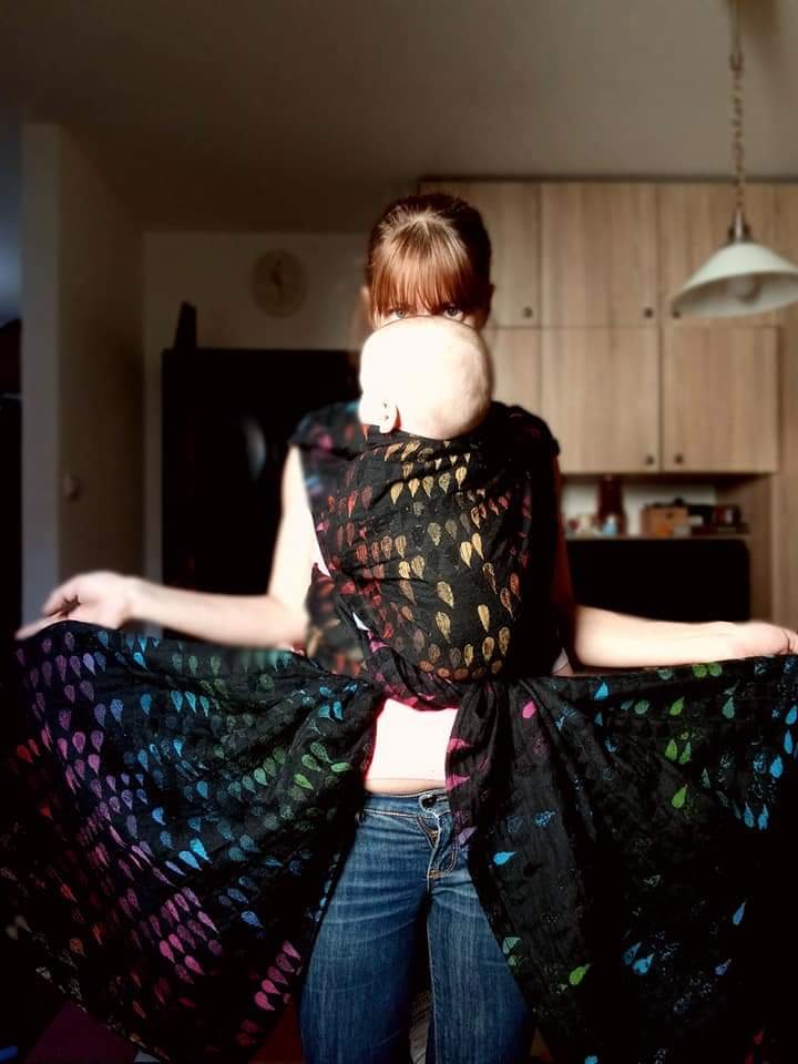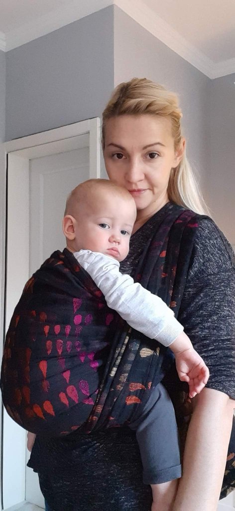 I was so happy that I was quick enough to apply for testing the WW Drops of Jupiter Prototype. Jupiter is my favorite planet and I couldn’t miss testing it’s Droplets! 😉 Iz was my first experience with wool in a wrap and I did expect some picking, but I didn’t mind it at all. The texture is amazing and so unusual, the colours accented by the black background. It is incredibly easy to tighten and I loved the size which is my base. Thanks to our locally organized #jupiterchallenge, I tried several carries for the first time and that’s why I love this wrap even more. Testees were both my boys, 10,5 months old baby weighing around 10 kg and 28,5 months old toddler weighing around 12 kg. None of them was very cooperative and willing to be carried for some longer time at the moment of testing.🤷 I am sorry we were using this beautiful wrap only indoors, but I am sure we would wear it often if we had the opportunity. Thank you so much #lenastravelingcarriers and #WovenWings! We really enjoyed our testing! ❤🖤