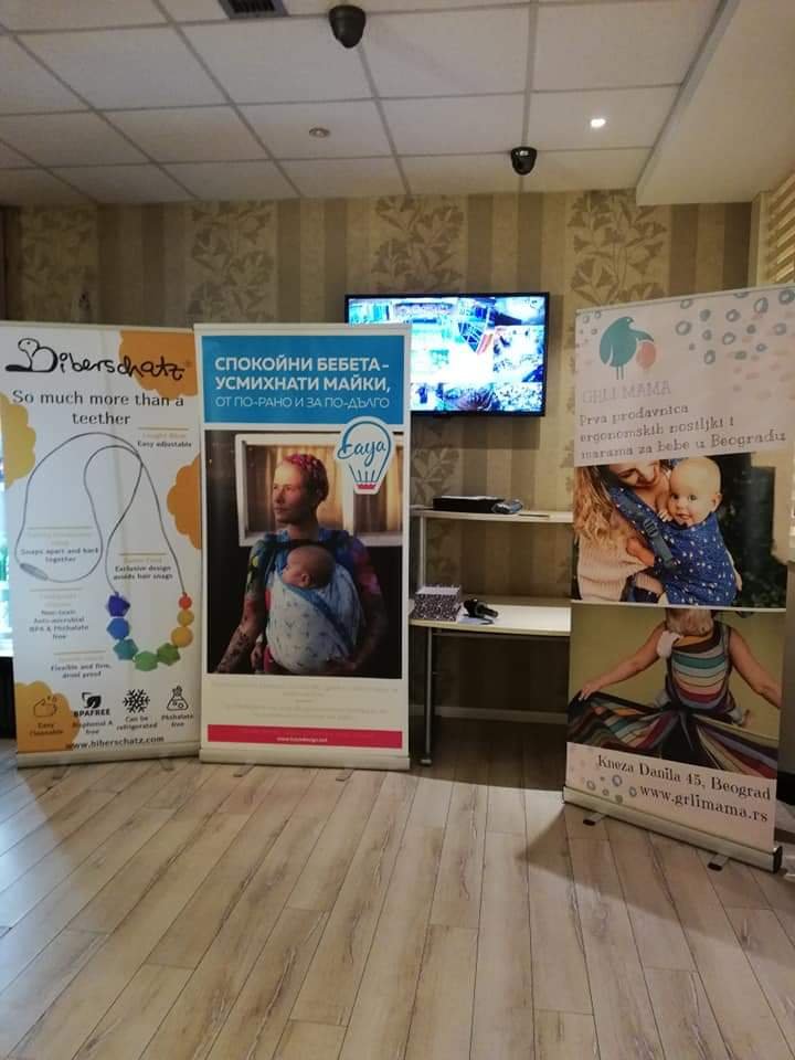 Isidora Kosić, babywearing consultant and also owner of Grli mama shop presented all types of carriers to explain better to parents options and benefits and how to use them.