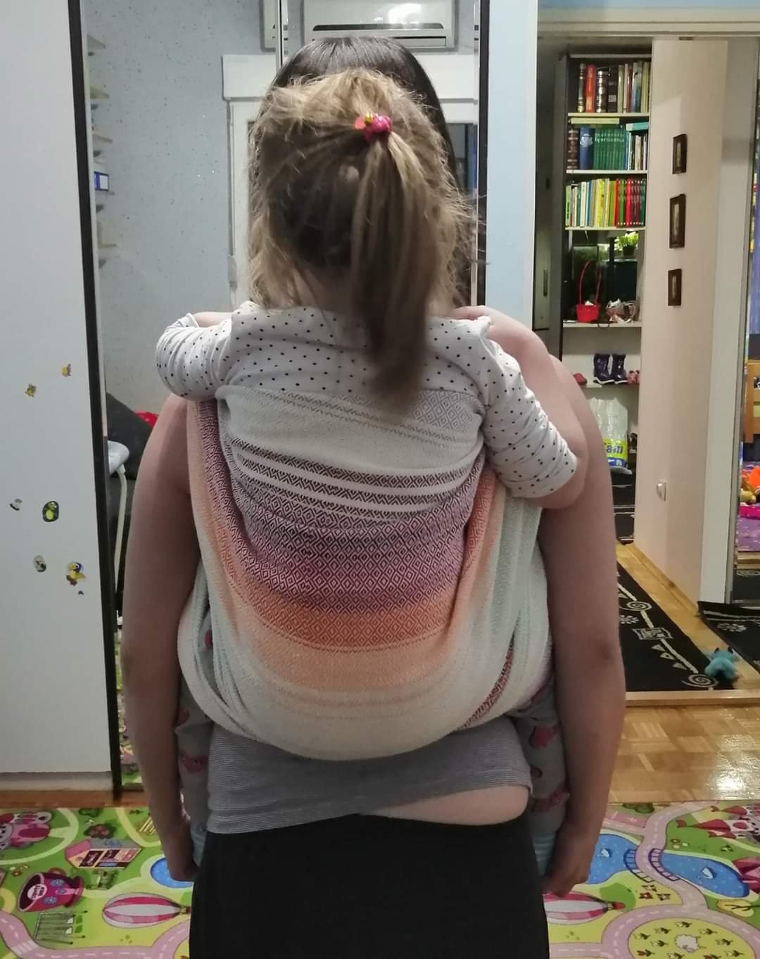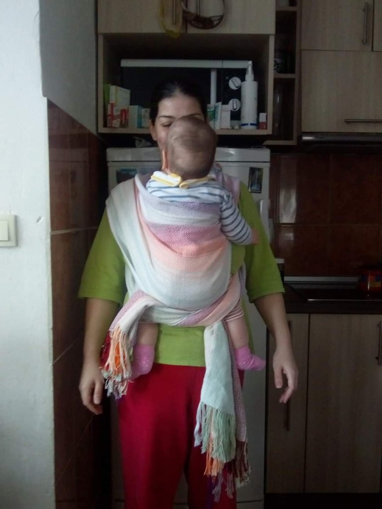 Thanks to Lenine putujuce nosiljke (Lena’s traveling carriers) we tested our first handwoven wrap made by the very talented Vesna Djinovic. The wrap has amazing colors and is soft and moldable. The only issue we had is that it was a bit too short for us, as I only tried wraps in sizes 5 and 6 before this one. It was great with a ring though. The baby tester was 14,5 months old at the time of testing and had about 10kg.