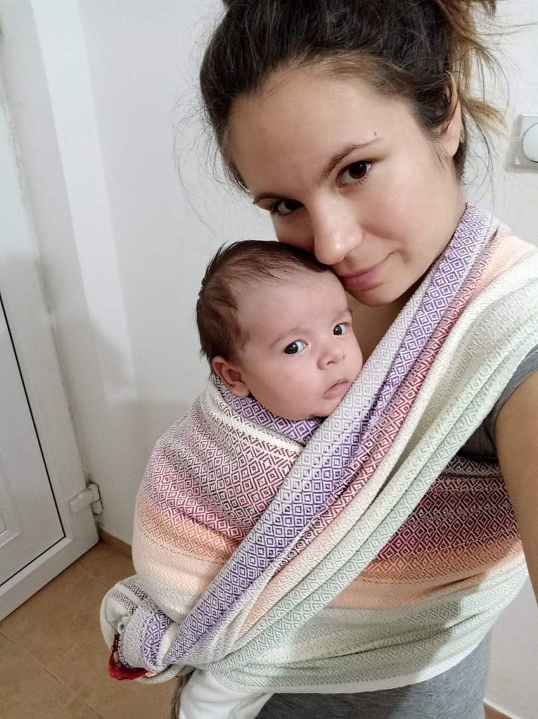 Thanks to Lena’s traveling carriers an Vesna Djinovic we had the opportunity to try this gorgeous handwoven wrap. On swallow wings is strong, but so soft and gentle, and the colour is just perfect. My baby is 6,5 mounts old, and 8kgs and he was enjoying in it too.
