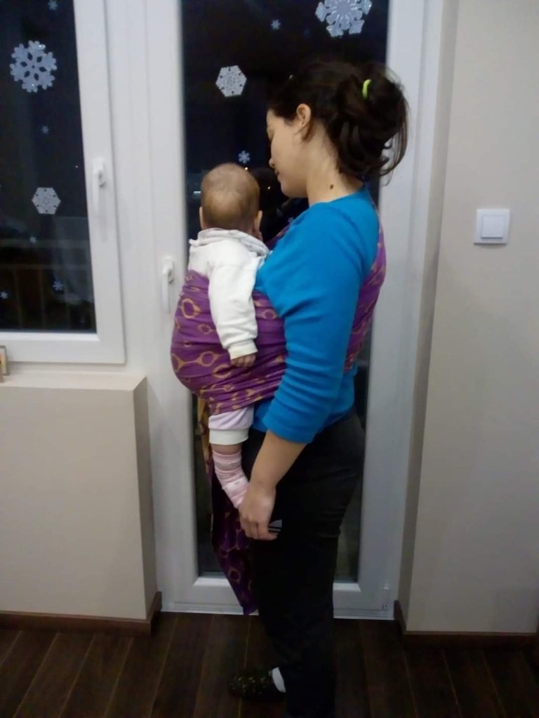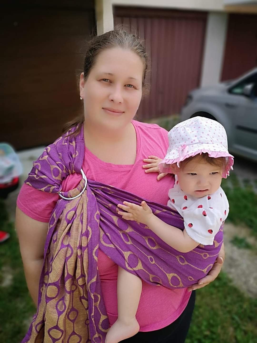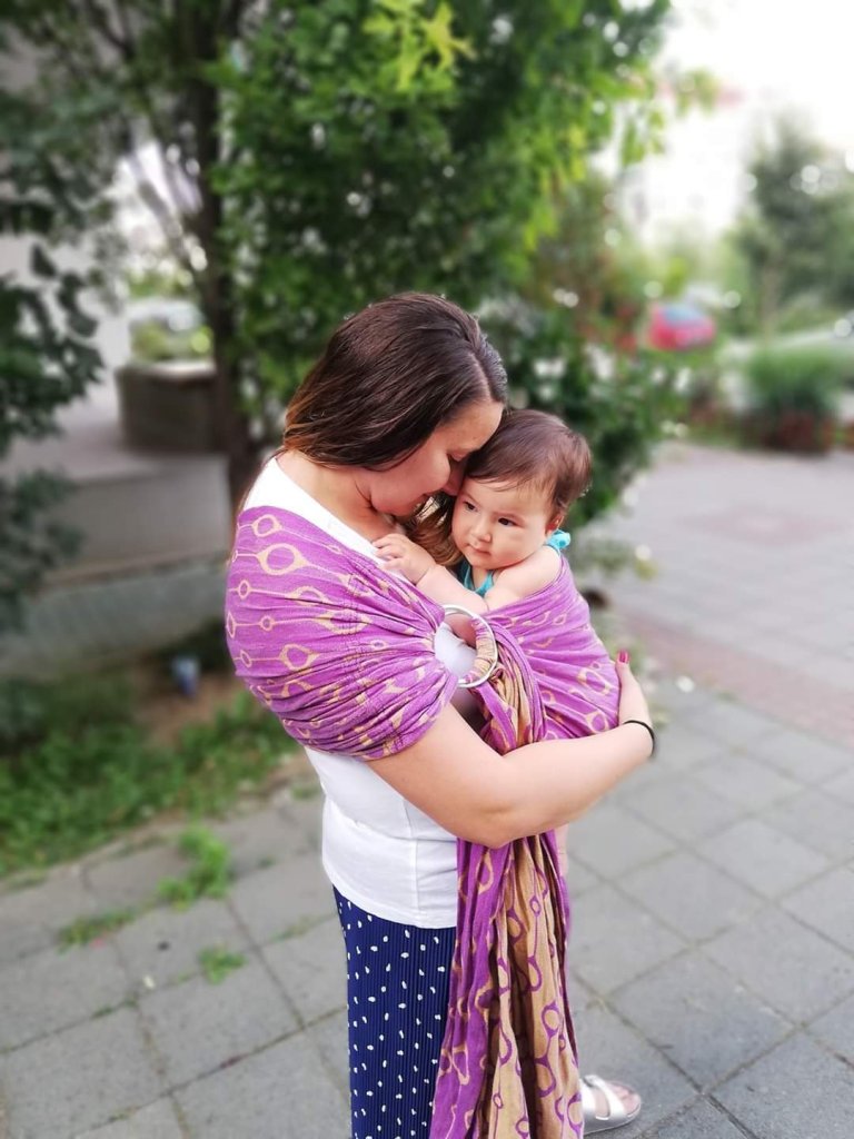 As soon as I saw this ring sling I was amazed by the design. The sling arrived freshly washed, and soft, and the colors were even prettier in person. The baby was 6 moths old, had around 8 kg and 68cm when we first received it. I tried to wear my baby in this sling, adjusted it over and over again, however, we just did not click. I felt the baby’s weight, and the rings would sometime get to low when I tried to adjust. The wrap would cut me on the shoulder, and I could not move my arm. I tried front and hip carry, and on the hip I did not feel as much weight, however it was the same on the shoulder. Unfortunately, this ring sling did not work for us, we simply could not adjust it, it was always too loose or too tight, and I think this was due to my lack of experience. The design and the material are beautiful, and the wrap is light in the hand.