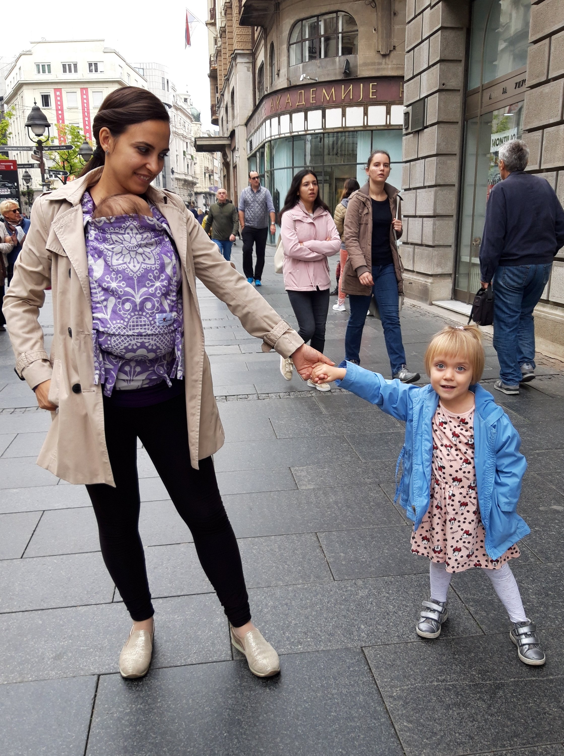 On my mind was this situation: Bus is coming. Me: “Please, sir, can you help me with this stroller? Madam, please, can you give hand to my daughter and help her to come to bus? Thank you! Nevena, please go with madam, give hand to her. It’s ok, she just want to help us. Sit with her, mamy will stay here with baby”. But my older girl wants to stay with me, baby starts crying… Our station – Please, can you help us to leave the bus?…” I didn’t want to depend from other people. And I wanted my free hands for walking and embracing my big baby. Then I heard that isn’t imposible when you use some wrap.
