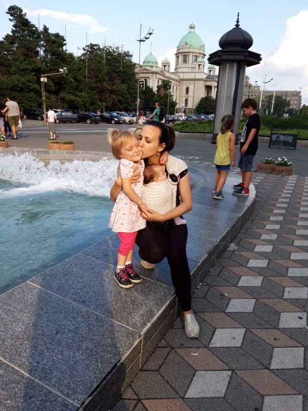 On my mind was this situation: Bus is coming. Me: “Please, sir, can you help me with this stroller? Madam, please, can you give hand to my daughter and help her to come to bus? Thank you! Nevena, please go with madam, give hand to her. It’s ok, she just want to help us. Sit with her, mamy will stay here with baby”. But my older girl wants to stay with me, baby starts crying… Our station – Please, can you help us to leave the bus?…” I didn’t want to depend from other people. And I wanted my free hands for walking and embracing my big baby. Then I heard that isn’t imposible when you use some wrap.