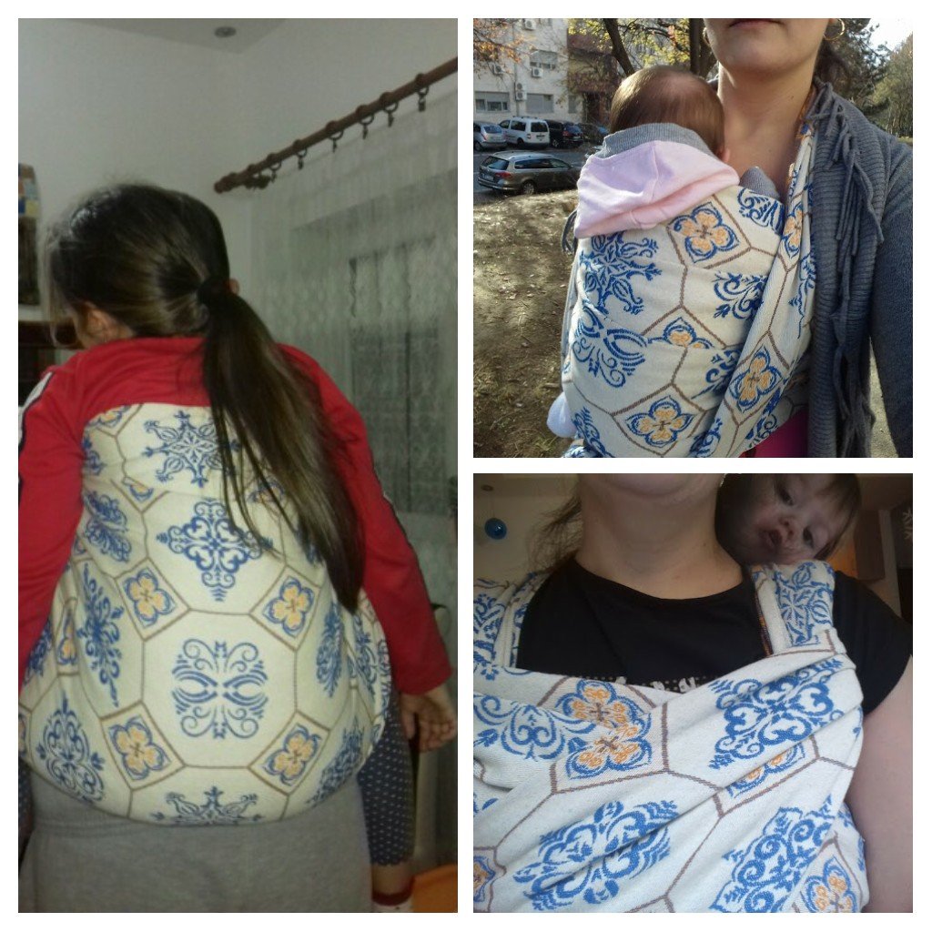 Pabelle slings Trip to Lisboa, 100% cotton, declared at 320gsm, but after the first wash the magic happened and I measured 400gsm. This wrap is soft as cloud, puffy, grippy, comfortable on the shoulders. Is not moving anywhere despite the messy business. The design and colors of the wrap are elegant and beautiful. On the one hand it shows the spirit of Lisbon and on the other it has oriental patterns.
