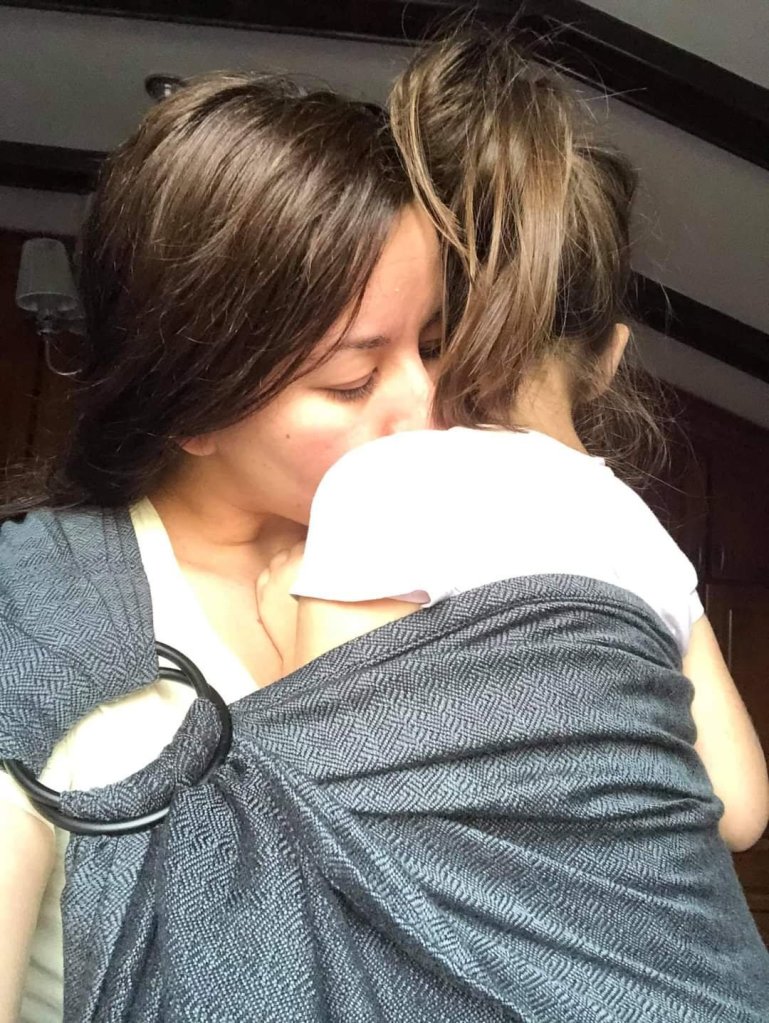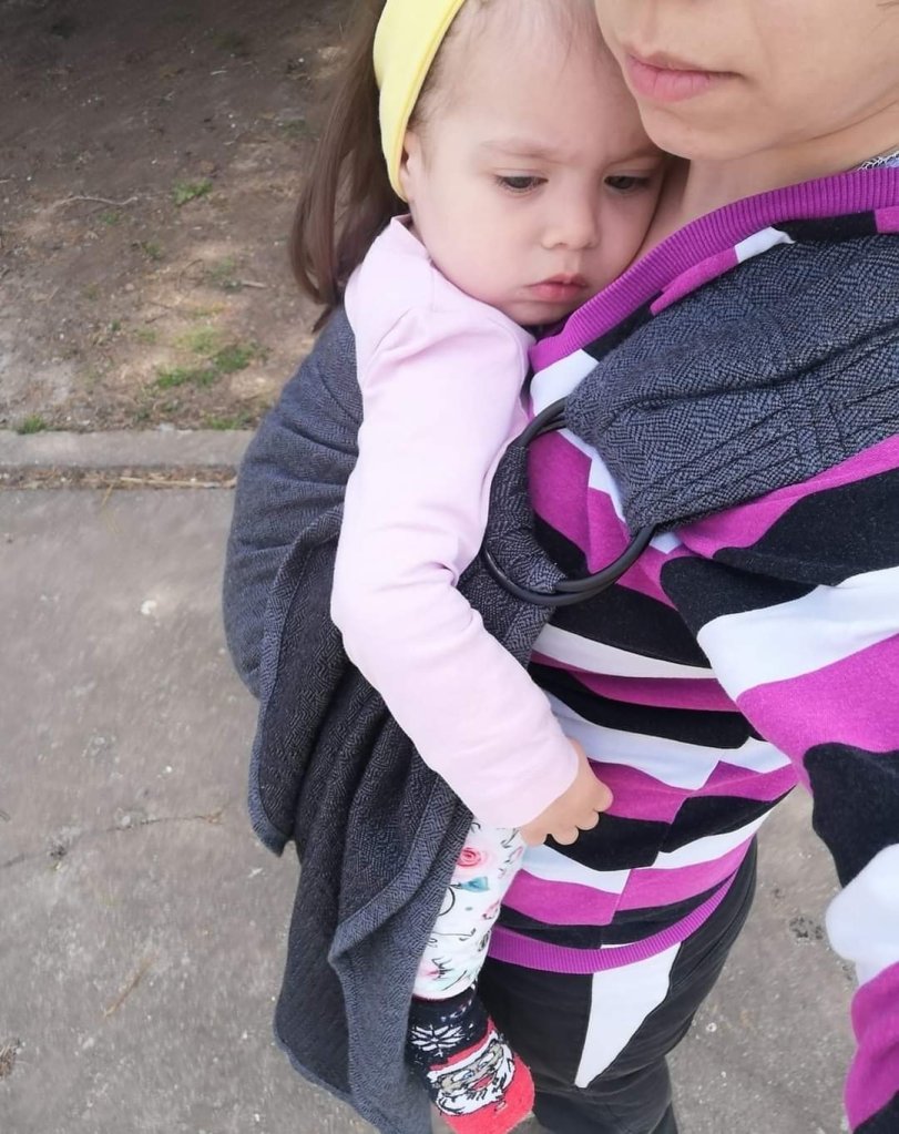 The Vanamo. The ring sling for every occasion, every season, every outfit. I know totally understand why it is so appreciated by many. It is beautiful, aery, light in hand, really comfortable. I still had a feeling it could be broken a bit more, but soft and moldable even like this. The size is perfect for me,since I’m short. Baby is 15 months old and about 10 kg. I felt a bit of that weight but probably cause we haven’t carry a ring sling in a while.