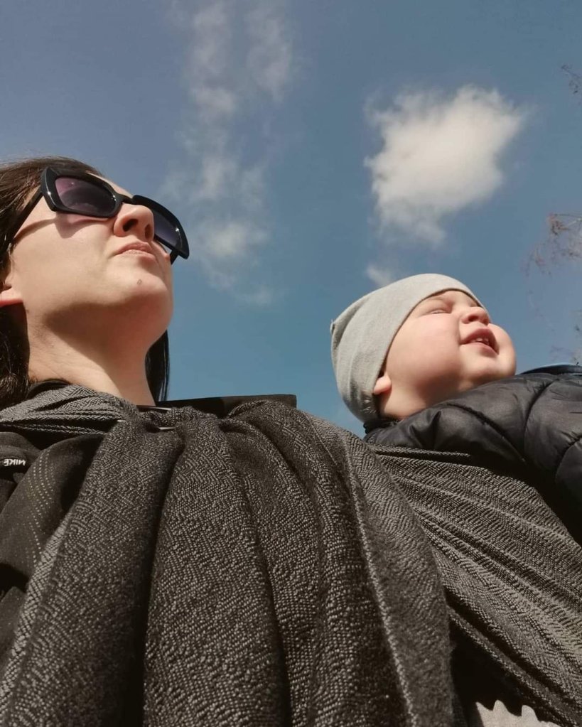 One word – Vanamo. This is the firs time I’ve tested a Vanamo shoulder sling – hybrid shoulder and I couldn’t imagine it would be rhis comfortable. I carried my 2,5yo boy weighting 12kg and we both enjoyed very much. He loves ring slings and this one is no exception. It’s perfect for summer and it’s not warm in it at all. I like how moldable it is and how it wraps around me and my kid perfectly. I didn’t think that with this much wool it would be so moldable but I was wrong. The color is surely my cup of tea and I enjoyed so much while using this sling. I’ve also tried it with my friends baby and it suited great for chunky 6mo 8kg boy.