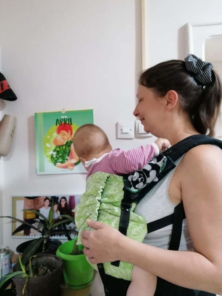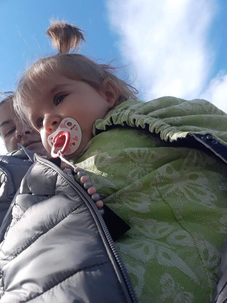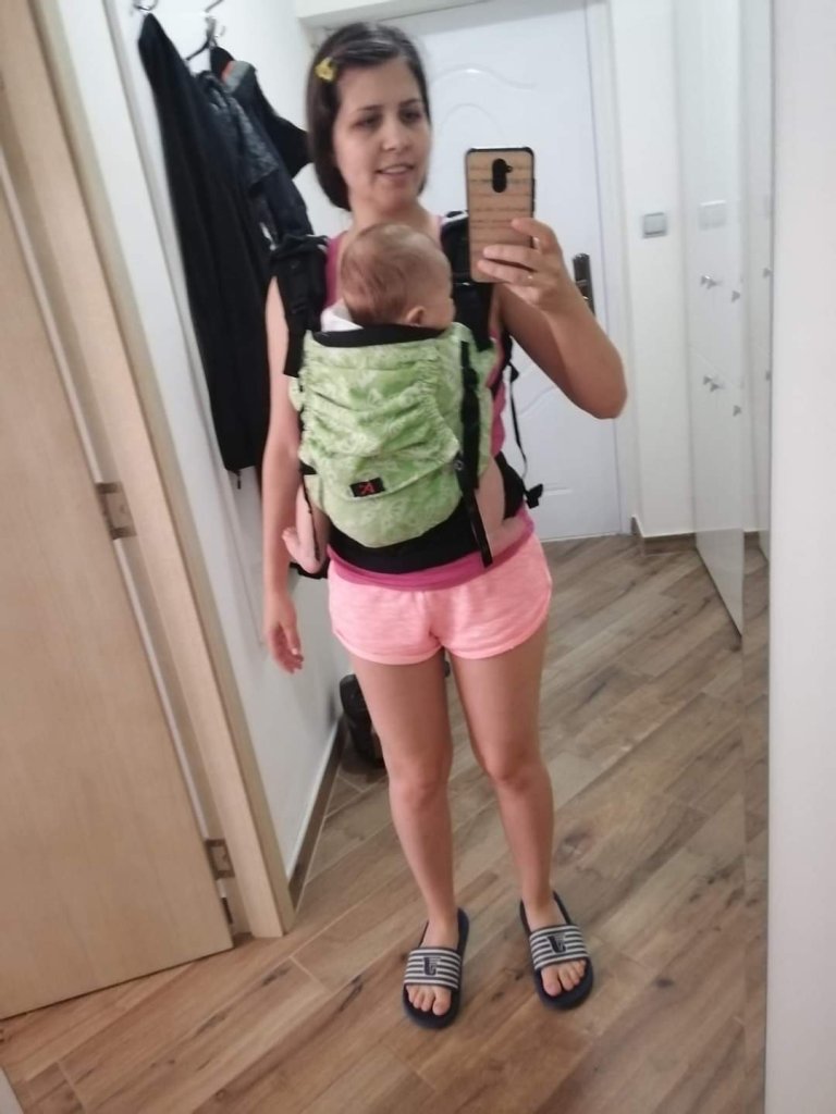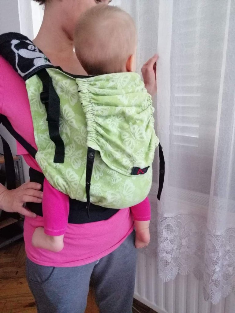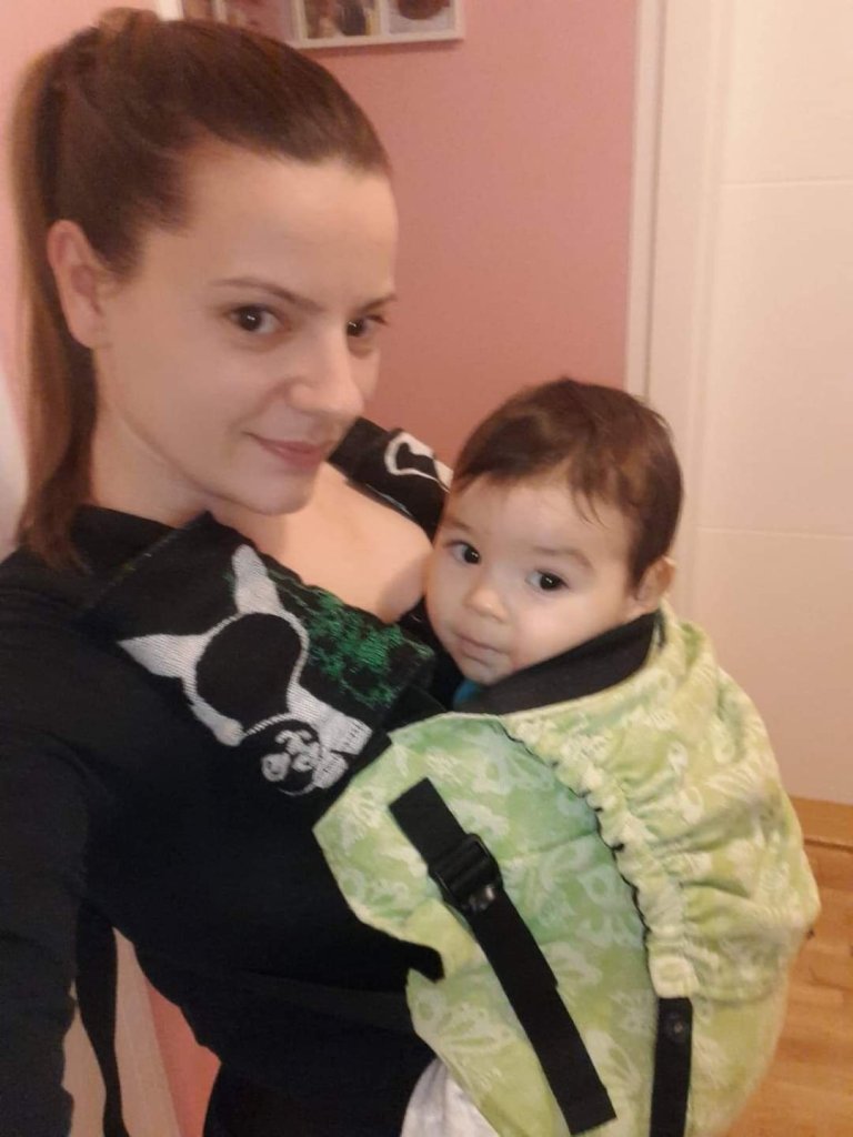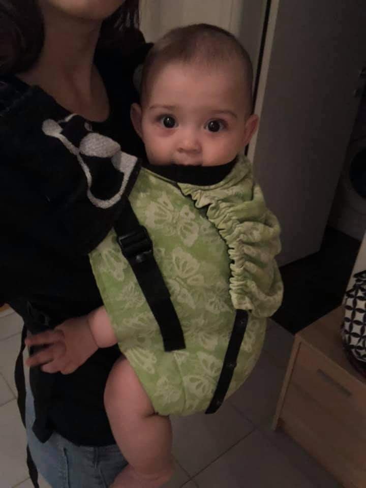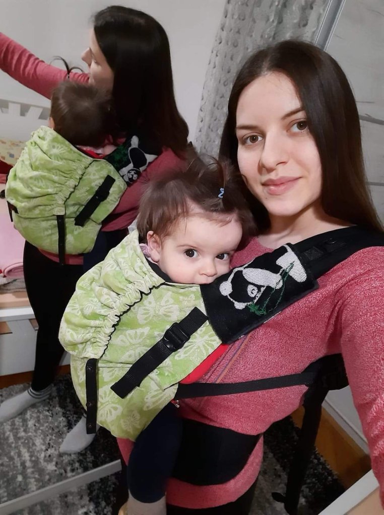 Thanks to Lenine putujuce nosiljke (Lena’s traveling carriers) and DracoMom Carriers- ex ZMajčice I had the opportunity to try this wonderful carrier. The baby is 11.5 months old and approximately 9 kg. I really enjoyed testing it, even though green is not my favourite colour. The carrier is soft, the belt is nicely filled so carrying the baby is really comfortable and the weight is not an issue at all. This carrier is baby size and the panel provided my baby with knee-to-knee support. Baby wears size 74, so I even reduced the panel height a little. When the baby put on a thicker vest all I had to do is to adjust the panel size and the baby easily slipped into the carrier with all her winter clothes. The strap was a bit of a problem for me, maybe because I’m clumsy and not so agile with my hands behind my back. Fastening on the left side was kind of hard for me, I guess I’m used to my short strap being on the right side. Here is a suggestion – that the cross belt connects in the middle of the back. That seems easier for me. It could be just me, though. I honestly didn’t notice that as an option on the carrier. In any case, the carrier is really comfortable and the baby and I enjoyed it. There is no mistake in buying this carrier.#lenastravelingcarriers