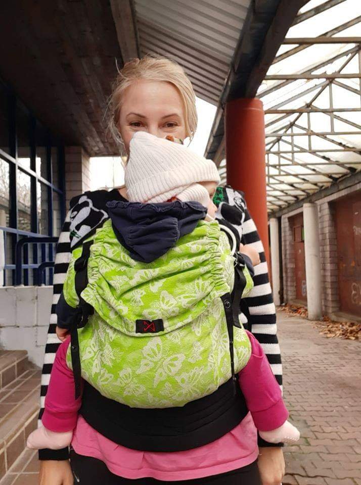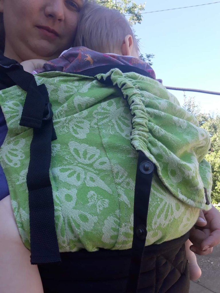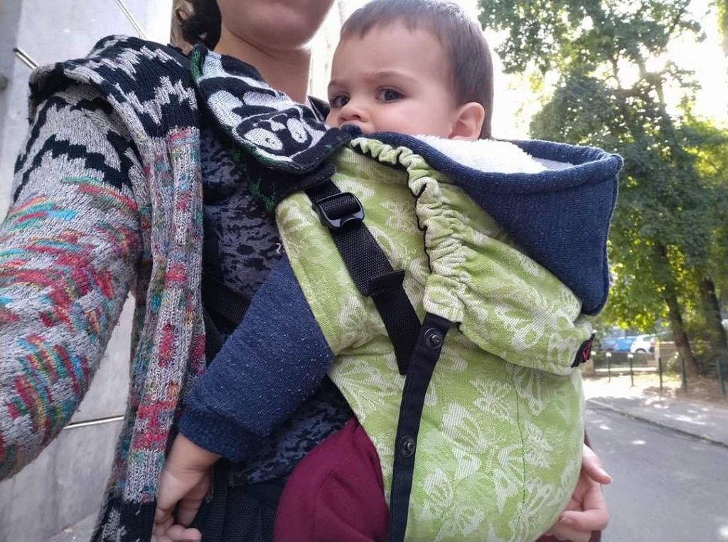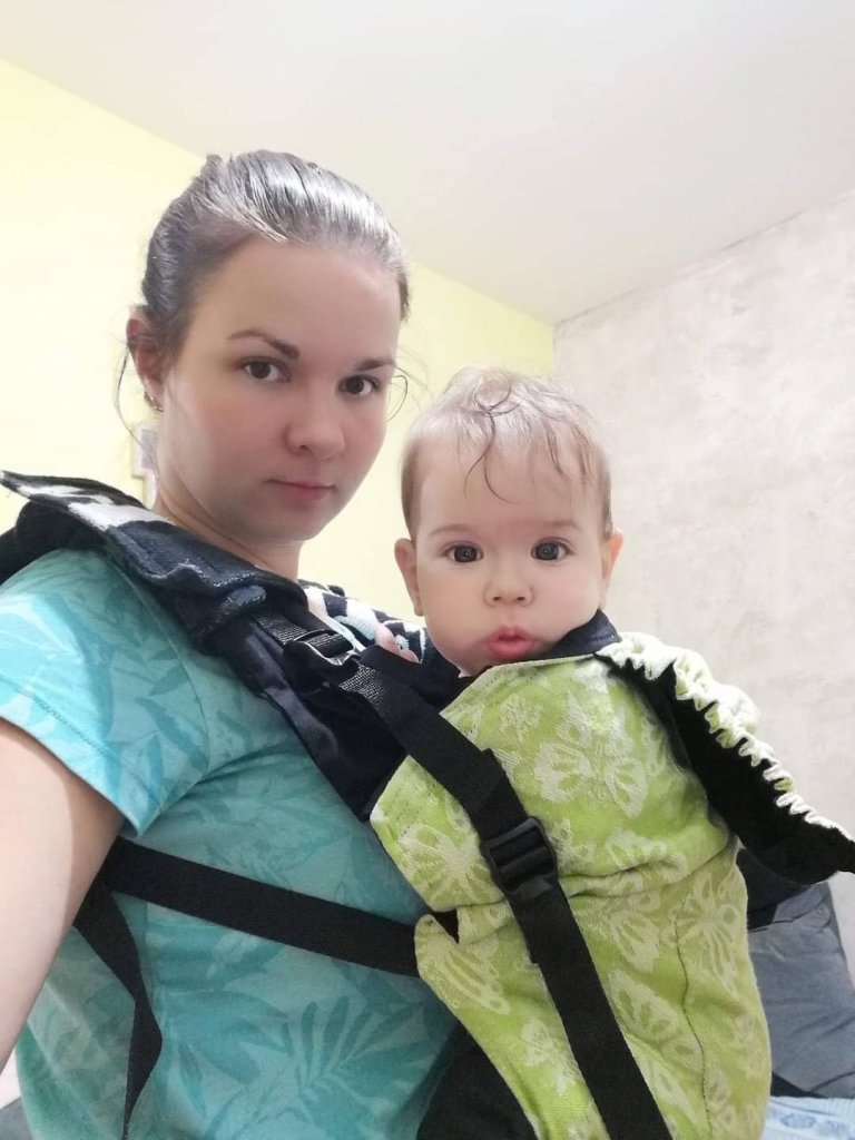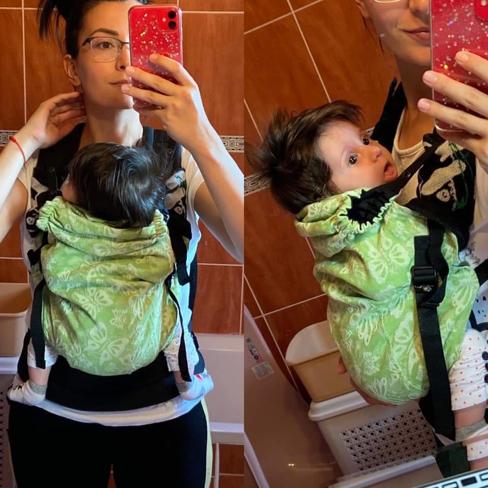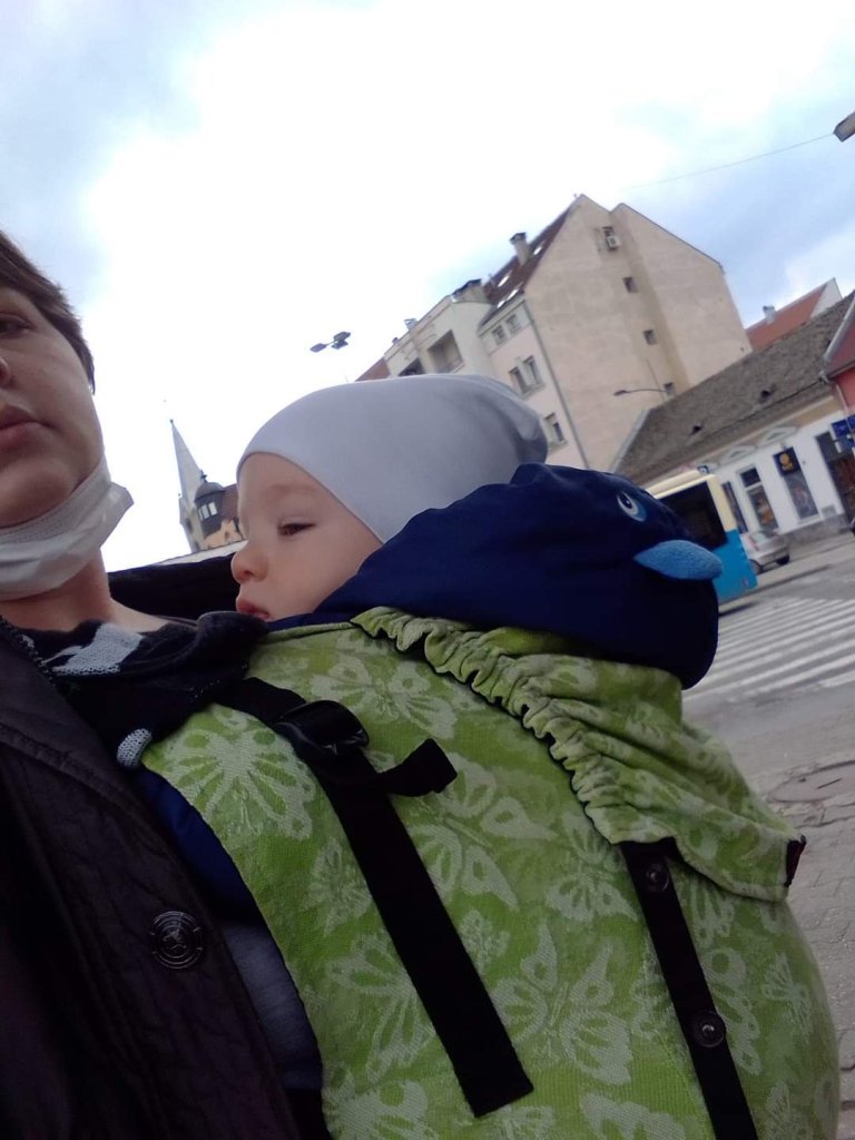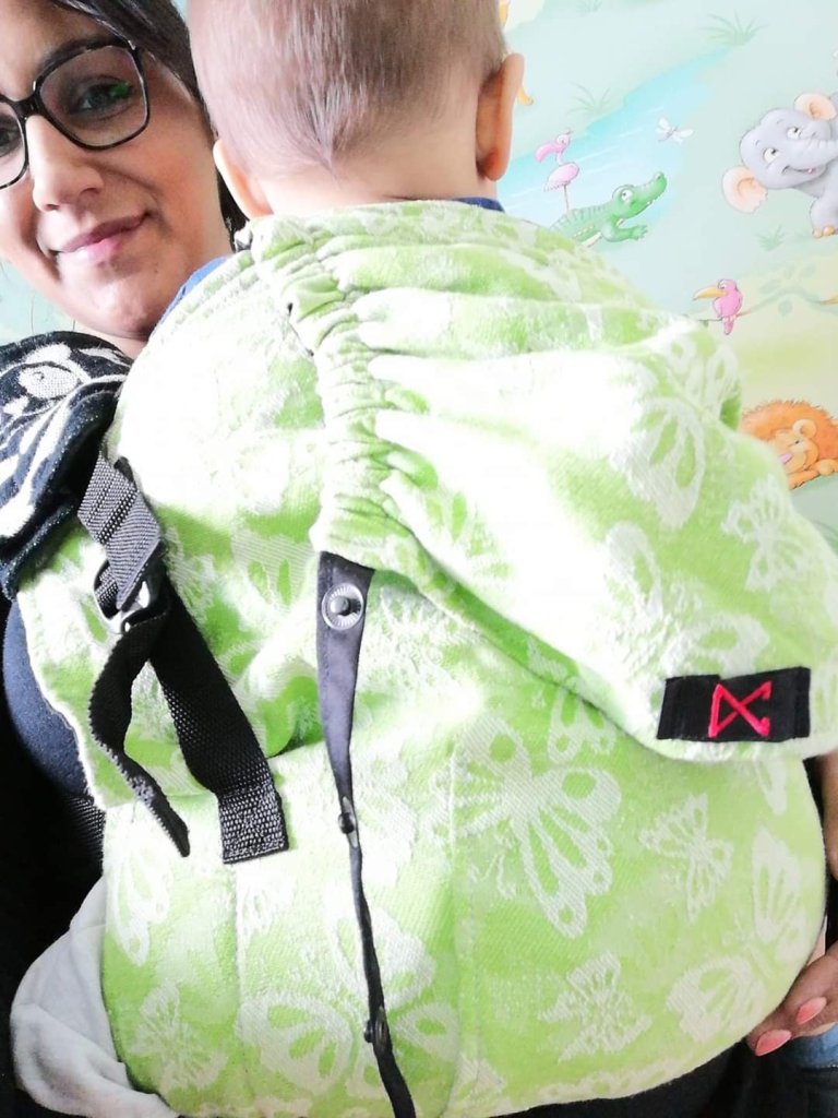 Thanks to Lenine putujuce nosiljke (Lena’s traveling carriers) and DracoMom Carriers- ex ZMajčice I had the opportunity to try this wonderful carrier. The baby is 11.5 months old and approximately 9 kg. I really enjoyed testing it, even though green is not my favourite colour. The carrier is soft, the belt is nicely filled so carrying the baby is really comfortable and the weight is not an issue at all. This carrier is baby size and the panel provided my baby with knee-to-knee support. Baby wears size 74, so I even reduced the panel height a little. When the baby put on a thicker vest all I had to do is to adjust the panel size and the baby easily slipped into the carrier with all her winter clothes. The strap was a bit of a problem for me, maybe because I’m clumsy and not so agile with my hands behind my back. Fastening on the left side was kind of hard for me, I guess I’m used to my short strap being on the right side. Here is a suggestion – that the cross belt connects in the middle of the back. That seems easier for me. It could be just me, though. I honestly didn’t notice that as an option on the carrier. In any case, the carrier is really comfortable and the baby and I enjoyed it. There is no mistake in buying this carrier.#lenastravelingcarriers