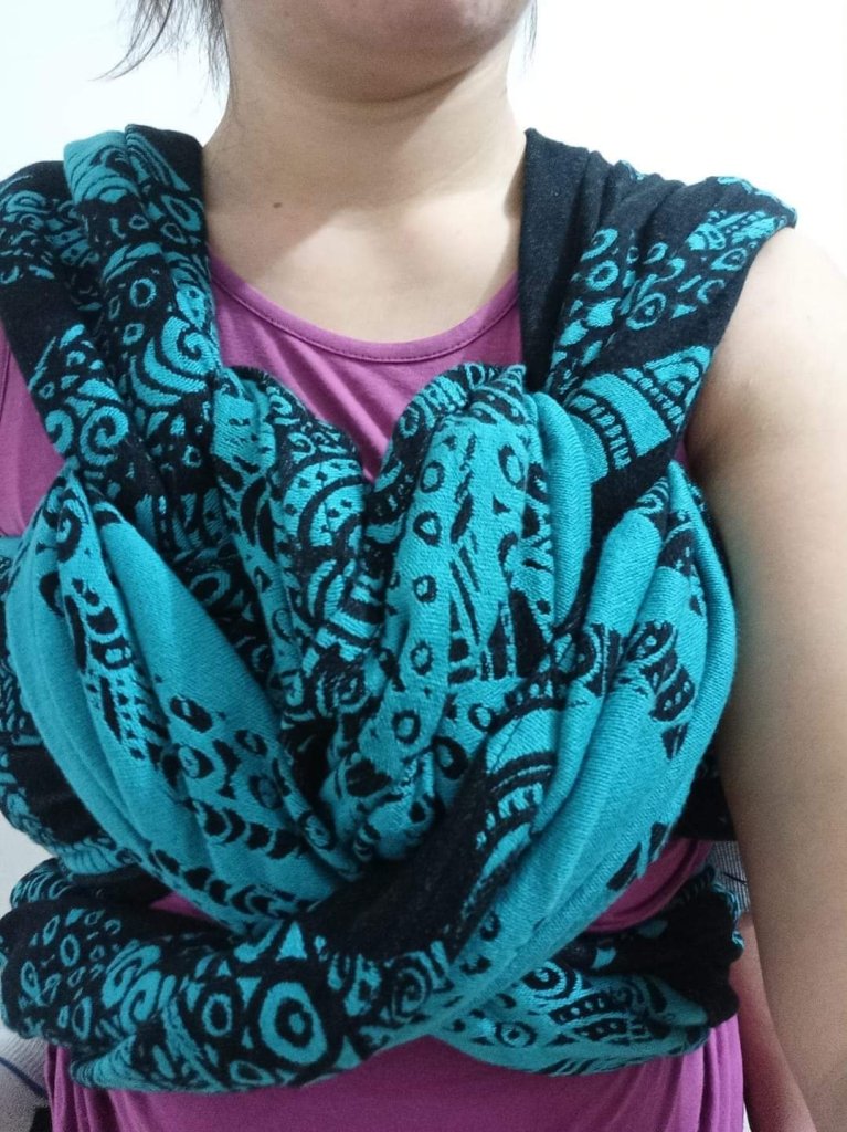 This scarf is the second I try to test and wear my baby (arond 1year old and 12kg). It easy to set up. The fabric is very thick and I think that this is very chalenging to wear in the middle od the summer but in other occasion I think that baby (especialy in the winter) will love it becase the scarf is like a hug, warm hug. I fell like I don’t have any weight in my back and sholders, the scarf is doing the bussiness and more. It is nice pattern with good fabric. Thanks to