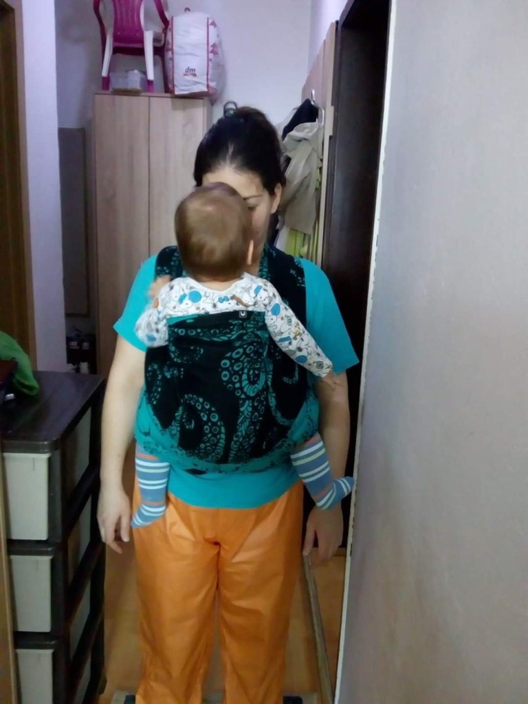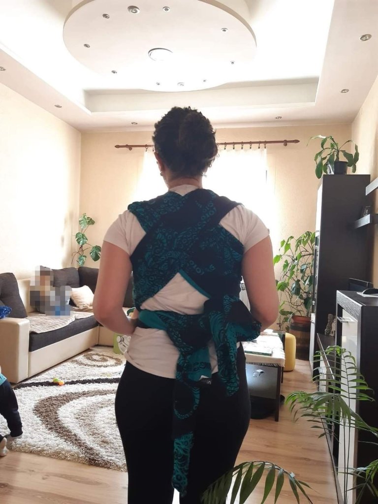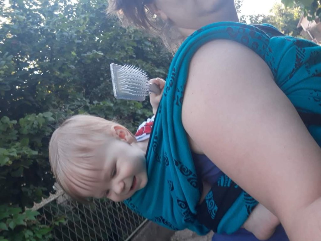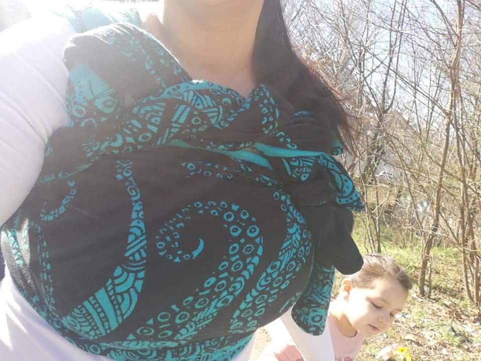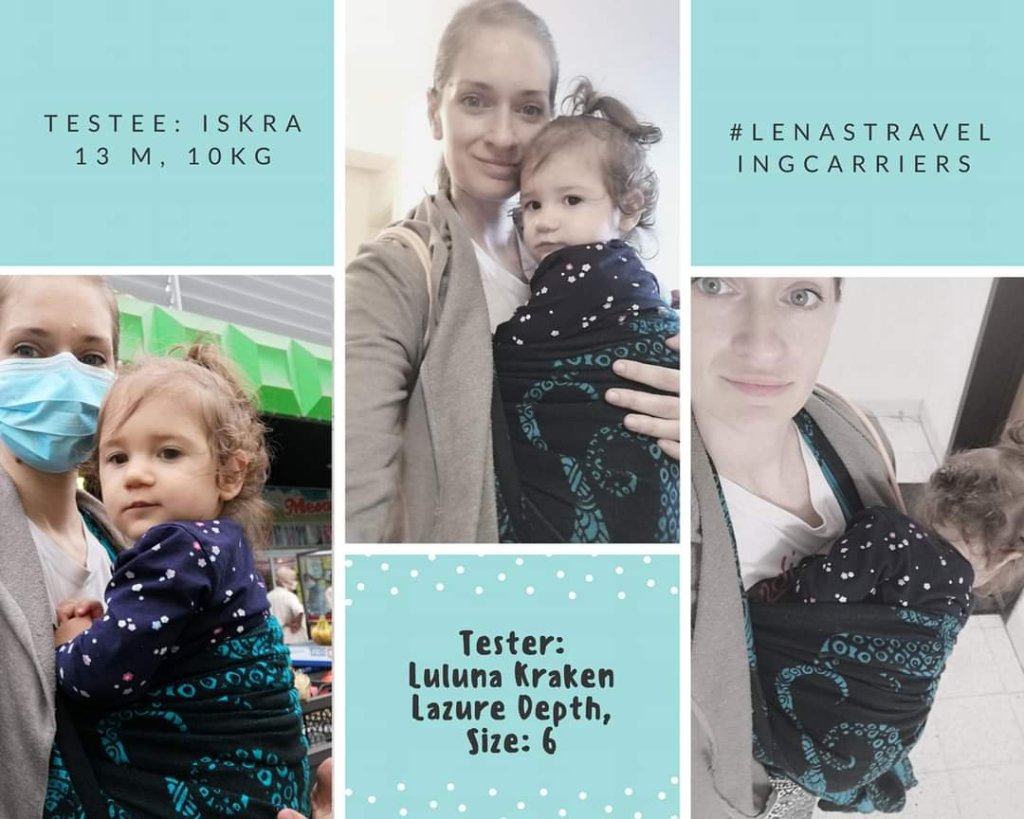 Thanks to Luluna Slings and Lena’s traveling carriers I have opportunity to try woven wrap Luluna Kraken Lazure Depth size 6. Firsth to all I love color of wrap because it match with son’s eyes. Second it is very soft and easy to wrap. Perfect begginer wrap. With my baby (11 month, 10 kg) I try front and back carry with diffrent finishes. Also I try with my oldest daughter ( 4 year, 15+ kg) and it hold her great. We enjoyed a lot because it’s came when my boy only fall a sleep while carrying him in wrap. Thank you for this oportunity.