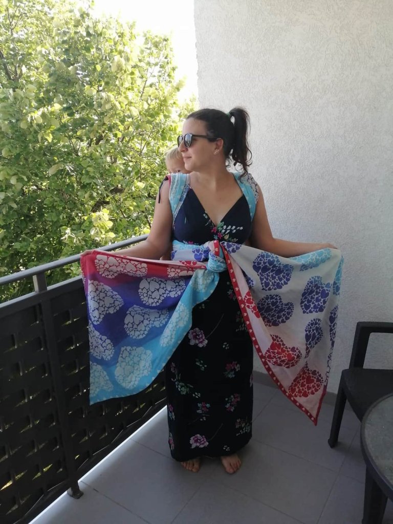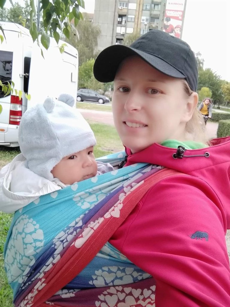 Wow!!! So big and heavy… that was my first reaction on Joe&Joy wrap, as it was my first encounter with a woven wrap. My baby is 2 months old and around 6kg, and although I thought because of the size of the wrap and me,inexperienced, it would be hard to try to carry, it wasn’t like that. Very soon we got the hang of it. At first it was a bit hard to tighten it properly, cause well,first time ever wrapping. I somehow had the feeling I had so much material in my hand while tightening but very soon I got used to it and got better in wrapping. Even although it was with us for couple of days,we managed to go hiking in the nearby mountain and climb on the high wooden viewpoint. The baby was asleep on my chest and I felt so light and motile. I didn’t feel the baby’s weight at all and the wrap somehow helped ease the pain in my back that I have since giving birth. Thank you LPN and j&j for this opportunity to enjoy this pretty colored and beautifully designed wrap.