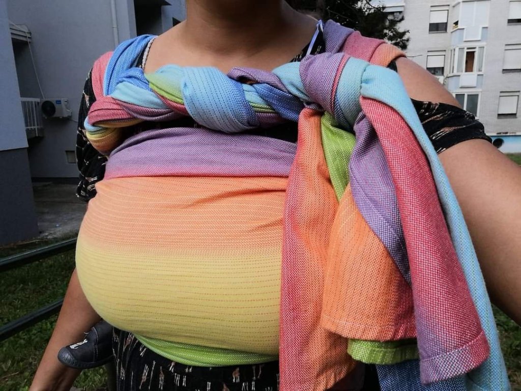 I didn’t manage to catch this wrap while it was on a test tour but as soon as it went for renting I grabbed her to fulfill my desire to try it on. I already have LF ring sling and I knew the wrap of theirs would be perfect to learn how to wrap my baby and new fancy finishes. When it came to us,baby was 3 months old and around 5,5 kg, and I felt ready to go on a new adventures in babywearing. I chose this wrap cause it’s perfect for beginners and learning how to wrap. Because it’s 100% cotton, it very good for small babies who vomit sometimes and color gradation is really helpful cause you know exactly on which part of the wrap you need more tightening. The material is strong and firm but at the same time very easy to work with. This is definitely one wrap for all the babywearing time. I was especially moved by rainbow color and rainbow baby symbolism, which I didn’t know cause I didn’t have that experience, luckily, but I really feel with other moms that did have and now I know why most of the brands has rainbow pattern, so as LF. Thank you Lenine putujuce nosiljke (Lena’s traveling carriers), for and opportunity to rent and use this wrap and carry my second baby. ❤️