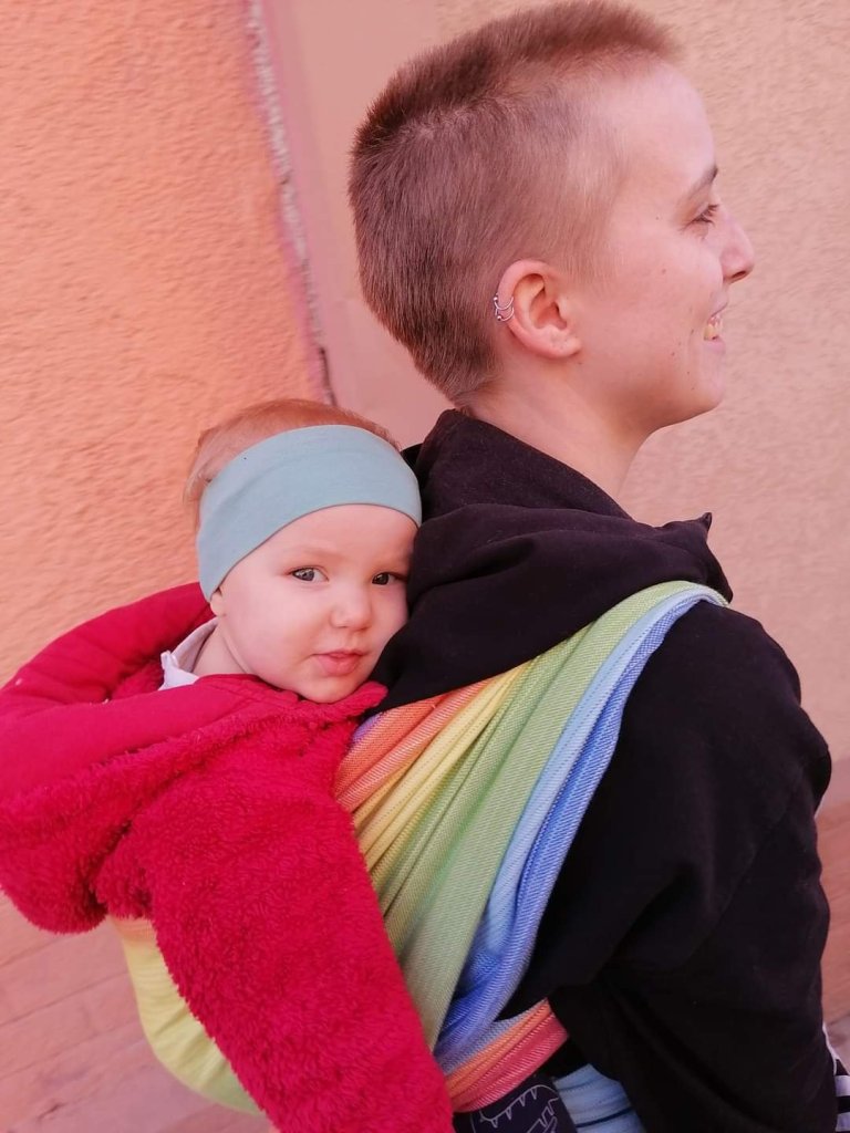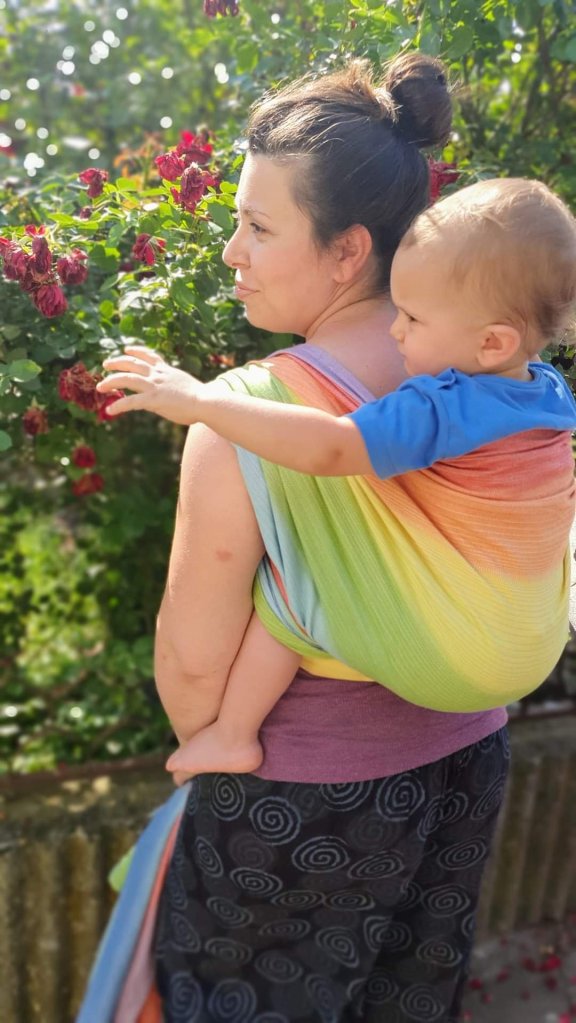 We tested #littlefrog Rainbow Aura size 6, for 5 days. This wrap is right for summer. It is light, airy, the colors are cheerful. Of course for the rest of the season it’s great if you ask me. I’m not sure how much GSM is, but I think it’s great for small babies as well as for big ones like mine. My son is 18 months old and about 12 kg. When worn in multi-layers, it holds its weight perfectly. It is very easy to adjust and tighten. I think it is a great choice for beginners in babywearing, no matter how old the child is. I have the impression that it is a little longer than the usual six, but that suits me very well. I’m sorry she was with us for so short, but I’m also grateful for the opportunity to try it out.