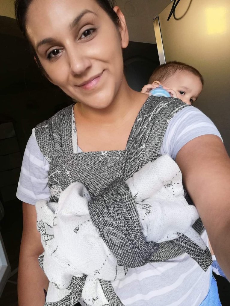 Thanks to Lena’s traveling carriers and Wild Sling, we had the opportunity to test this beautiful wrap Les Tenebres Granite. My baby is 7 months and about 7,5kg. This was our first experience with magnificent vegan wool, and we loved it. The white wool side is perfect, soft and delicate and the grey cotton side is very strong and supportive. It is very moldable and we enjoyed in testing.🥰