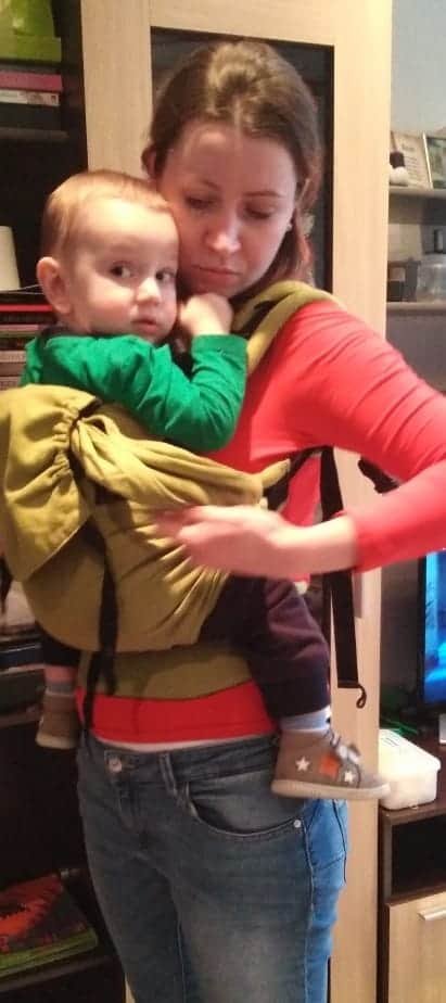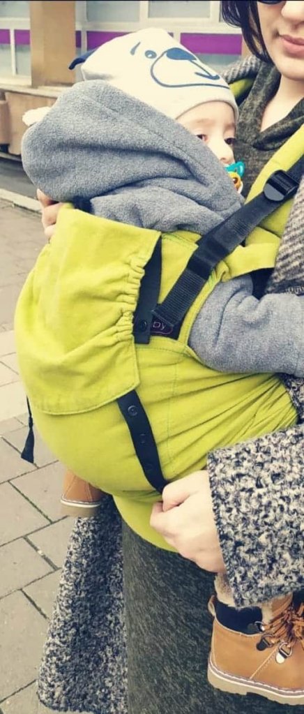 I’ve sent the carrier away so to summarize the impressions. The carrier is soft,interesting,different. I carried my baby only upfront (ah, the baby will start walking long before I learn how to backcarry!) so I didn’t use all the benefits from this carrier. I have set it up in an instant but it was really hard to take it off. Maybe I’m out of practice ( I own a Ruckelly so I’m used to buckle up at front). Mainly, the strap was hard to reach and I had troubles to unbuckle it ( and since it’s a brand new carrier,maybe it’s not “slippery” enough yet). Baby is 9+ months old, 11 + kg, 75 cm so it was (wearing a jacket) comfier for him to put the arms over the panel. Otherwise , I couldn’t set up the panel during the carrying. I wanna accent the importance of correctly setting up the sideway strap: if it’s not set up correctly,after 10 minutes my shoulders felt like falling off. A couple of times after, when set up in the middle of the shoulder blades,I didn’t even feel the weight.