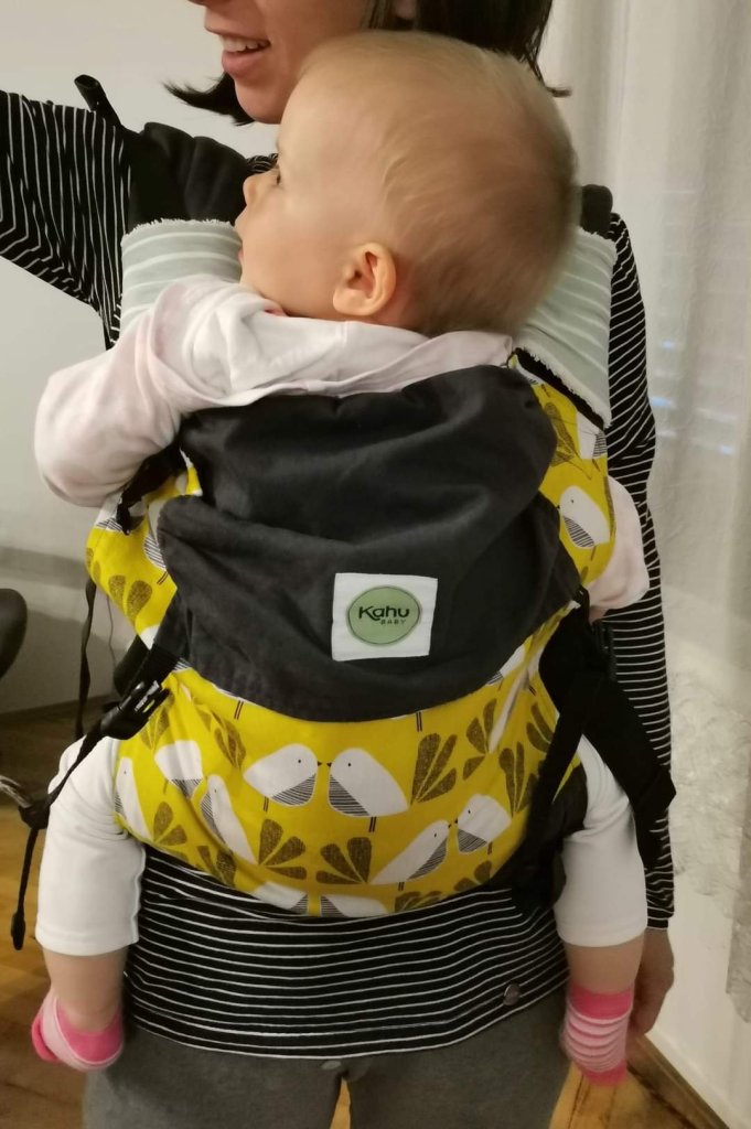 Thanks to Lenine putujuce nosiljke (Lena’s traveling carriers) and KahuBaby, my 6 month old baby and I, had a great pleasure to test this amazing carrier. It is a bit different from anything I tried so far because of the soft and thin waist belt. On the first sight I fell in love in this beautiful yellow color and pretty birds. The design of this carrier instantly improved my mood. It is really soft and incredibly easy to adjust. The shoulder straps are very comfortable and I didn’t feel the weight of my 7 kg baby. Sometimes I had an impression that we are maybe still small for this carrier (baby wears size 74) because of the panel height, his hands were always inside of the carrier. Beside that, I really liked how small and light this carrier can be when it is folded, it can fit to every bag. I enjoyed testing this carrier and my baby had a great nap time during every walk. Thank you so much.🙏#lenastravelingcarriers