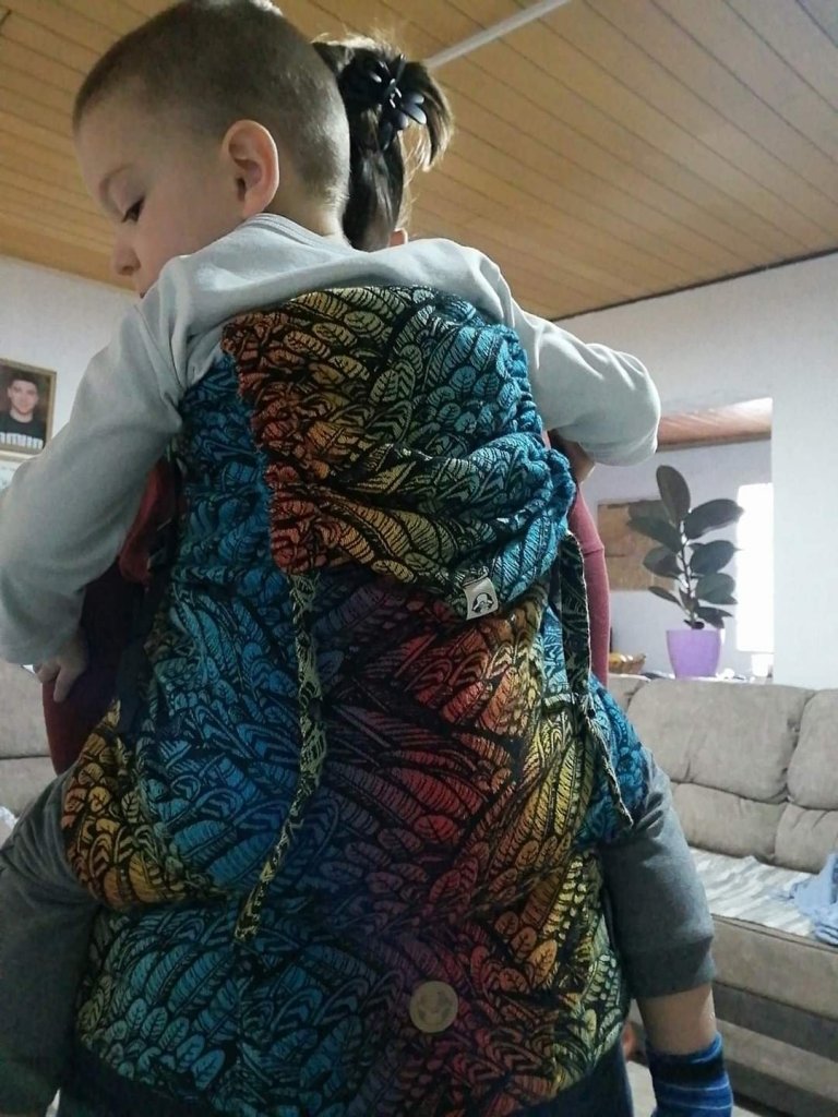 My impressions and review of this carrier are based on one month so far of babywearing during a slightly warmer winter time, with an almost three year old child that weighs around 13 kg and has the height of 90cm. We are on the smaller side of adjustments, maybe it is even a little bit big for us, but that means she could be carried for at least 3/4 years from now. First of all, I simply adore the pattern. It has everything, the rainbow colours, the grafitti&indigenous sort of touch to it, but also dreamy and birdlike, ready to fly into the skies. It is also made of thick material in two layers I believe, but airy too, and the glide/grip ratio is perfect. The belt is wide enough, even though I do prefer firmer ones. I think a pocket on the sides would have been a better idea because it is not easy for me to reach this one in the front, so I don`t use it at all. Also I am used to the buckle on the belt in the middle of my back, not the side, and it did take me a while to get the hang of it. The shoulder straps are very wide, thick, comfortable and with lots of adjustments. Due to my height (not a very tall person at all and on the plumpier end too) and the toddler`s too, I wish the bottom of the shoulder straps were attached to the panel a bit lower because it does tend to dig into my armpits a bit when I am front carrying. I am not used to babywearing with crossed straps, which doesn`t mean that is not comfortable, it`s just that I always forget I can try to do that do. I will try more carrying in this way in the future. As for back carrying it is really great and my toddlerina is trapped enough for her wildbeastlike outbreaks sometimes, it calms and soothes her quick enough that she falls asleep fast. Thanks Lenine putujuce nosiljke (Lena’s traveling carriers) and Grli Mama for this wonderful opportunity. I had a chance to try out the Lenny Lamb preschool carrier. I reccommend it for bigger kids that still like to snuggle, for taking longer walks, or just getting around the town, shopping, going to the kindergarden etc.