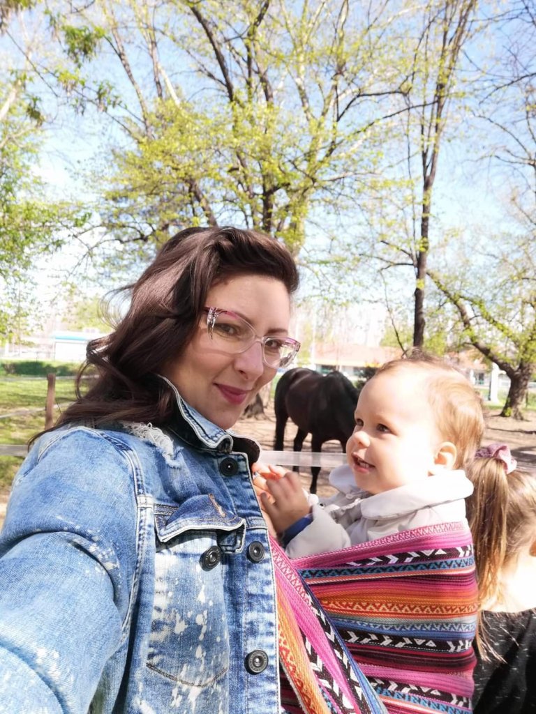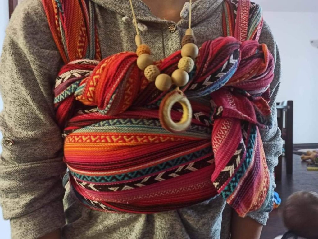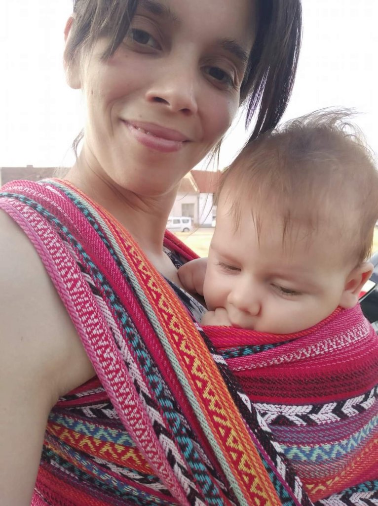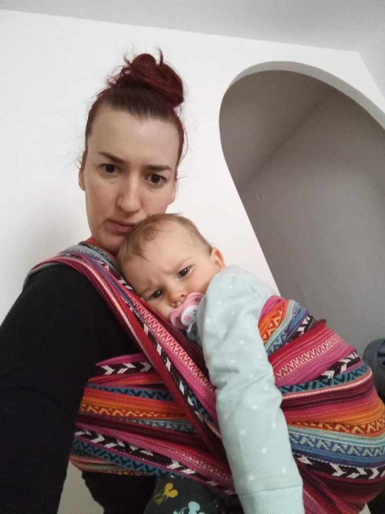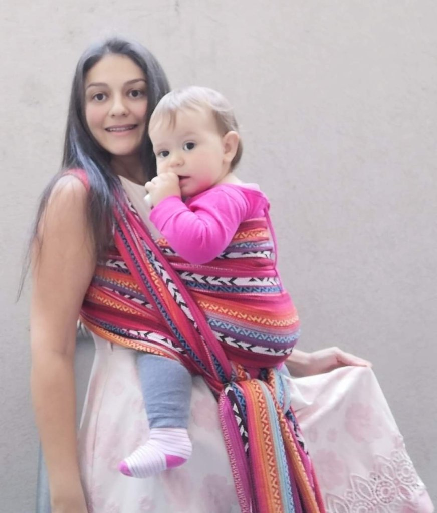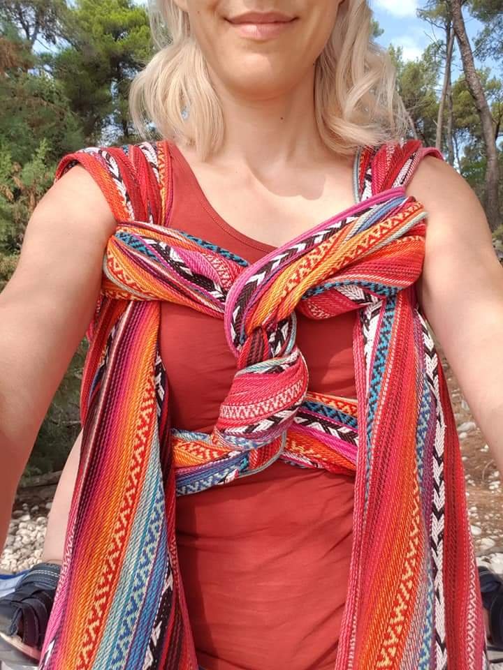 Thanks to Lenine putujuce nosiljke (Lena’s traveling carriers) and Almitra Tattva- Babywearing Art Studio for the opportunity to test this colorful and wonderful wrap – Almitra tattva Larona in size 6, 100% cotton. Soft but firm, it holds both small and large babies perfectly. It is easy to adjust and roll and stays stable for a long time. I completely fell in love with the colors, the softness and the weaving. The picture shows a baby of 4.5 months and 10 kg. I also quite easily carried and wrapped my older daughter of 2 years and 14 kilograms.
