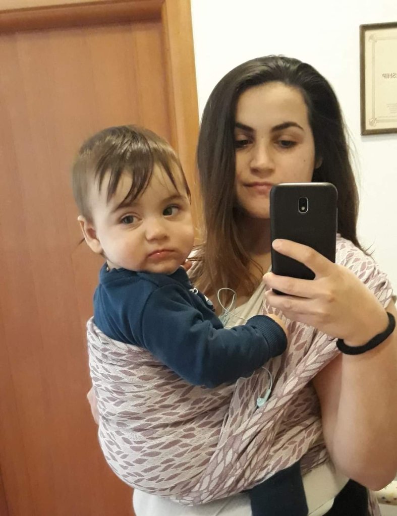 Me testing again, it’s become sort of a thing I do every week, test different wraps, carriers and slings, thanks to Lenine putujuce nosiljke (Lena’s traveling carriers) (for getting hooked on this 😁). I already have a Nona wrap, the famous red butterflies, but to be honest I haven’t really been breaking it. I hung it in my older kids’ room as a swing, to break it and to swing too. Sometimes I watch “This is us” on the desktop while the ~2 of us~ swing in a Nona 📺
