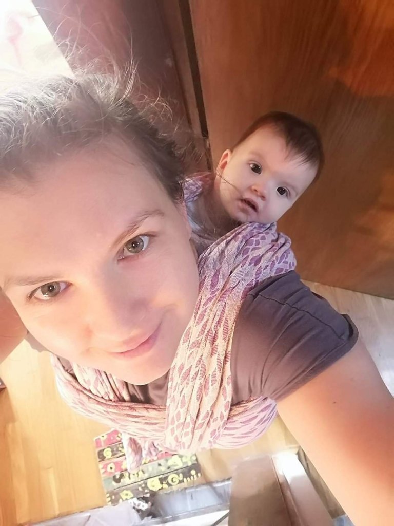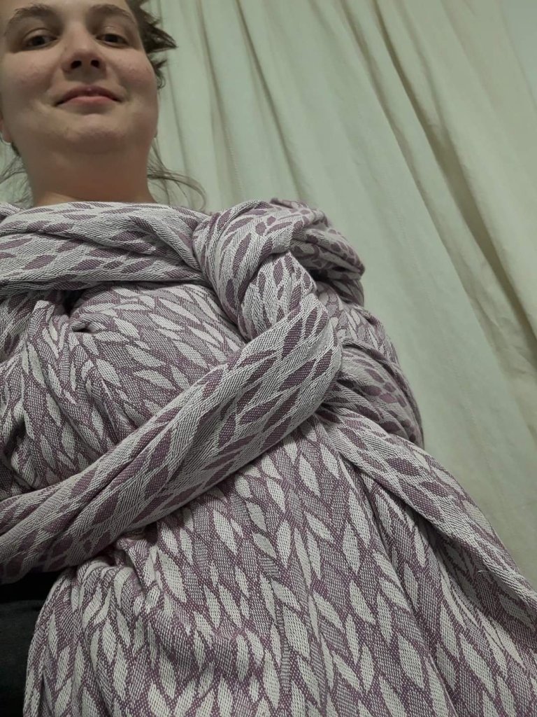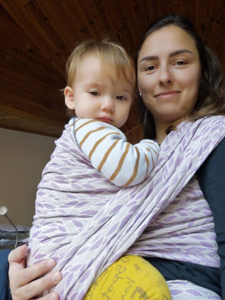 Thanks to Lena’s traveling carierrs we had the opportunity to test the Nona Imagine Wisteria Lane in size 7 wrap. As a beginner, it was a little harder for me to cope with the length of the wrap, but there is room to play with different finishes, so I would recommend it to someone more experienced. We definitely enjoyed it and I have a wonderful feeling of being tucked in with a baby who was 9 months and 10+ kg at the time of carrying. The color is beautiful in person. My favorite.💜