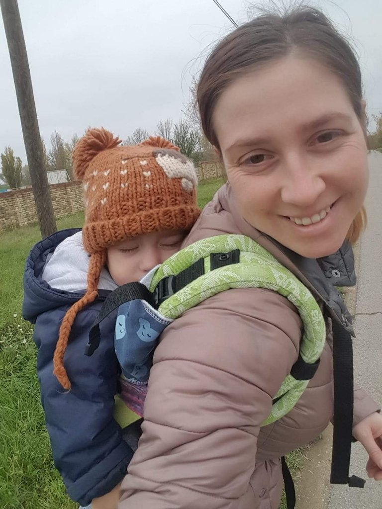 Thanks to Lenine putujuce nosiljke (Lena’s traveling carriers) we were able to enjoy in this magnificent carrier for 6 days. When it came, the first thing that surprised me was how light weight it is, and not bulky at all, though it is a todler size. My younger son is 16 months old, about 10kg and 80cm, and when I narrowed the seat and shrinked the height of panel, it suited him perfectly. Adjusting the size of carrier is very quick and easy. Only thing where I had the problem is pulling the stripes, like they somehow get stuck in buckles, or just don’t glide well, so it went a bit harder for me. But that was only the problem when I already put the carrier on. Also, when my little one fell asleep on back carry, I couldn’t manage to lift up the hood, the straps where short for me, I would like they were a bit longer. Altogether, this is one very good carrier, very comfortable, I am so glad i tried it, now I know where to look and find if some day I have a desire to own one.