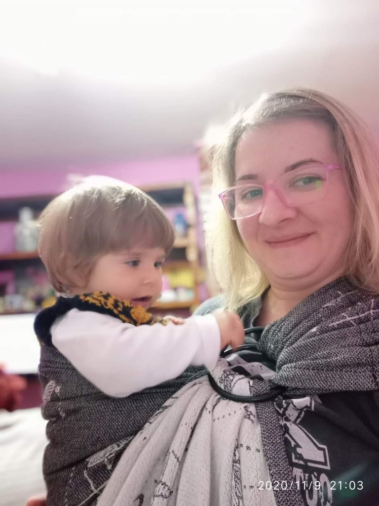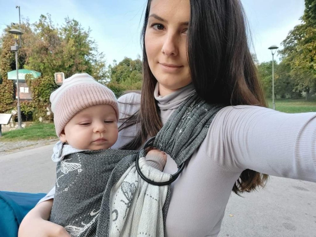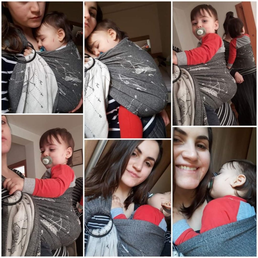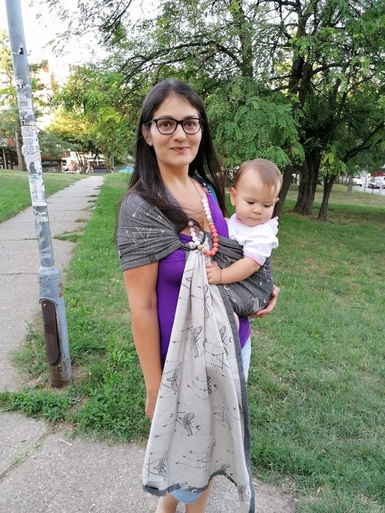 Thanks to Lenine putujuce nosiljke (Lena’s traveling carriers), I had chance to carry my girl in Ring Sling Wild Slings Les ténèbres, it was my first ring sling so I had a little problems with positing but at the end I did it and I really like it, baby as well. Sling is very beautiful, modern and elegant. Big recommendations from my side, for this beauty.