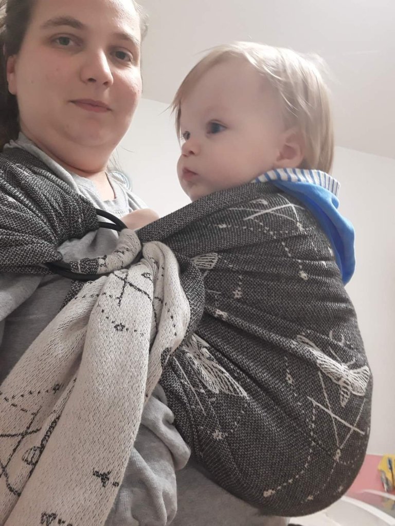 Wow wow wow. Actually this words are saying enough but let’s start from the beginning. Wild Slings Les ténèbres came to us and we had that pleasure to test it. First time when I take it in my hands I was really surprised how light it is. Soft but not, sounds crazy but actually it is like that. White side is like a cloud, soooo soft and grey side has really interesting texture. My baby is almost one year old and around 10kg. It was so easy to set it up, wrap slides through the rings really easy. It was really comfortable on my shoulder and it holds perfectly. It is great for toddler but I would say it would be good for little babies too. I’m really grateful to Lenine putujuce nosiljke (Lena’s traveling carriers) for this opportunity to try something so beautiful. I would be more than happy to have something like this in my stash.